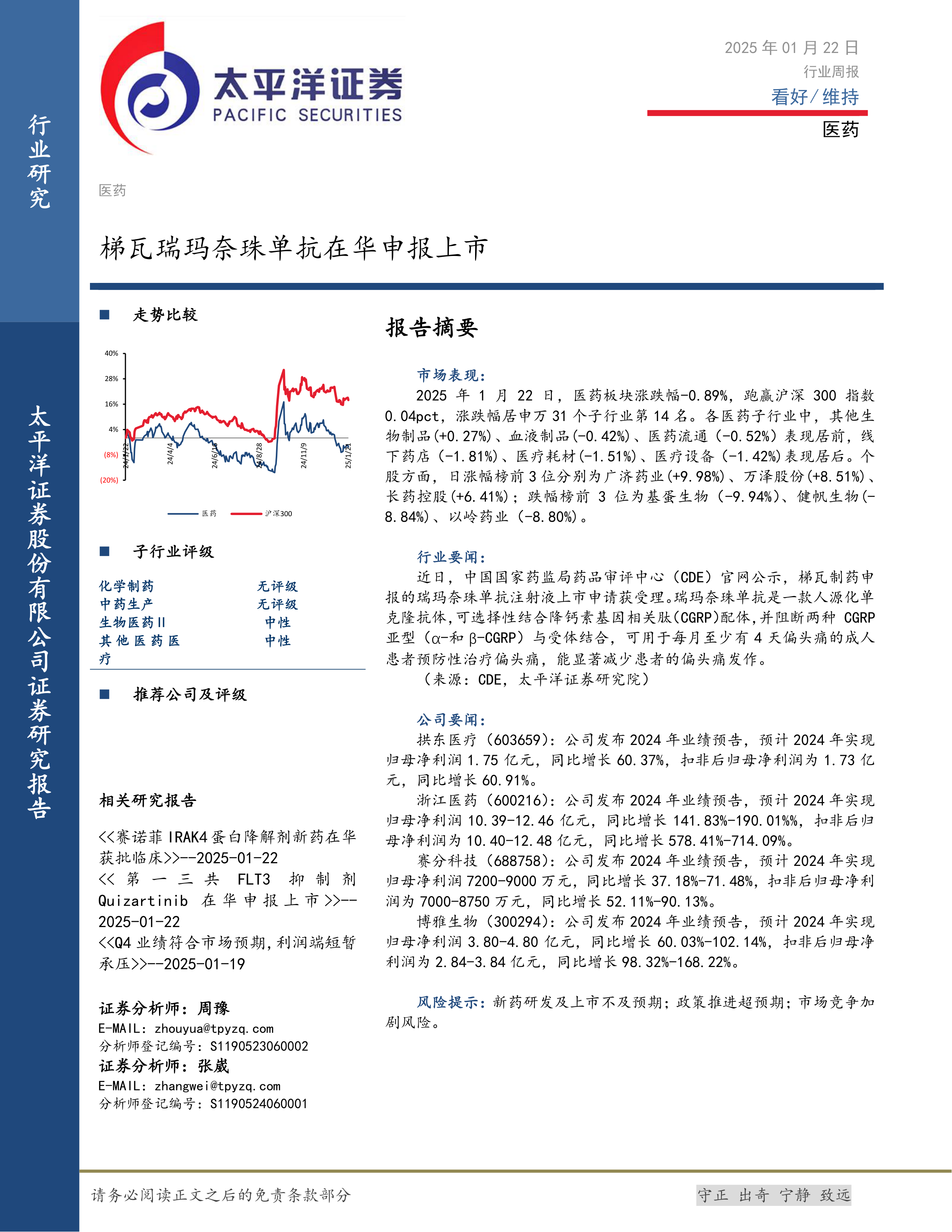 本报告分析了2025年1月22日医药板块的市场表现,指出医药板块跑赢沪深300指数,但内部子行业表现分化。其中,其他生物制品、血液制品、医药流通表现居前,而线下药店、医疗耗材、医疗设备表现靠后。