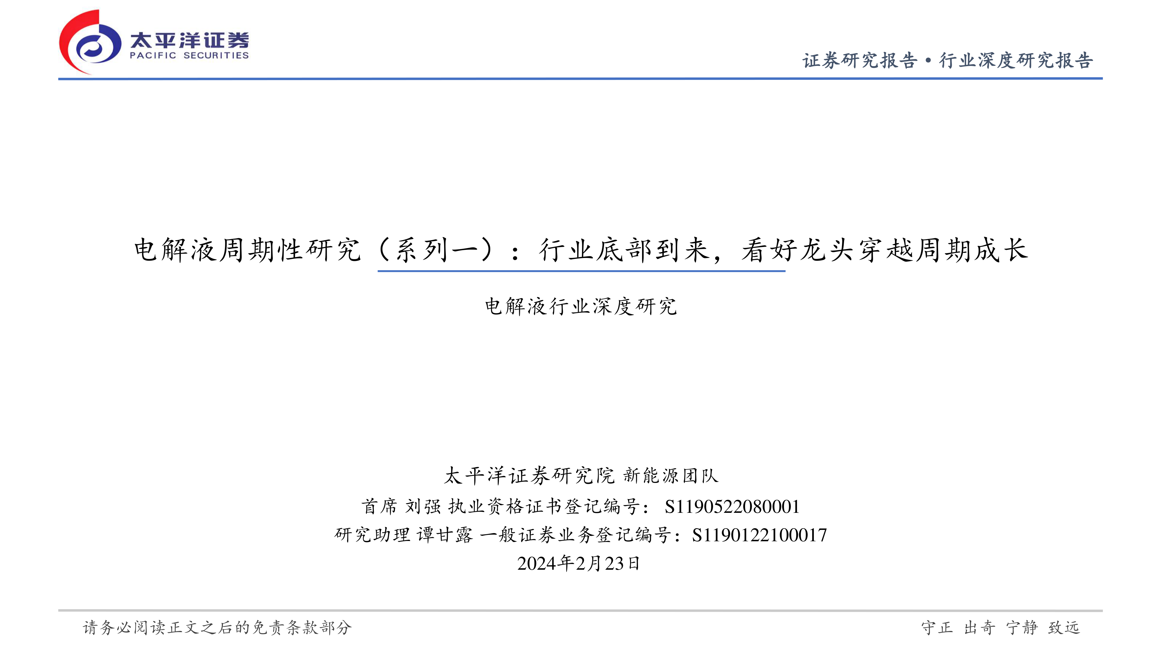 本报告深入分析了电解液行业的周期性特征,指出该行业盈利弹性大、触底反转领先于其他环节。通过复盘历史周期,报告认为当前电解液行业已处于底部区间,2024年是新一轮布局的关键时机。在行业出清阶段,具备成本优势、一体化布局、绑定头部客户以及积极布局新技术和海外市场的龙头企业,有望凭借其核心竞争力穿越周期,实现份额和盈利的再次提升。