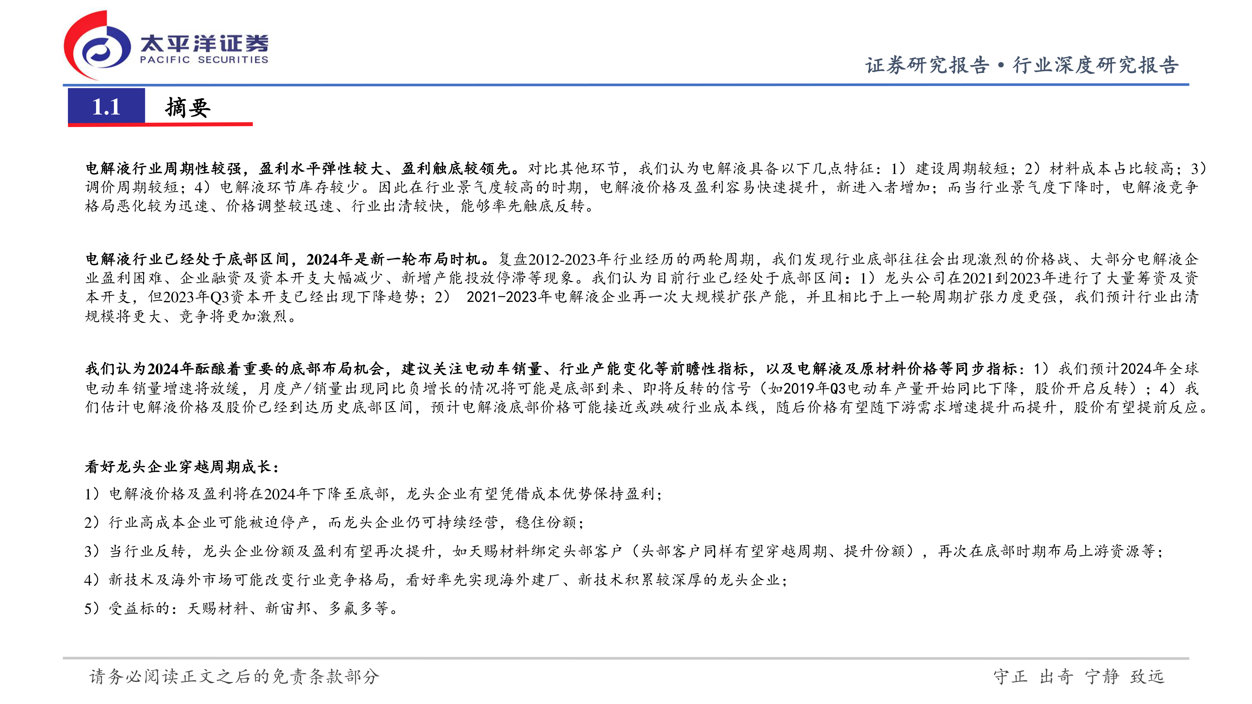 1)电解液价格及盈利将在2024年下降至底部,龙头企业有望凭借成本优势保持盈利;