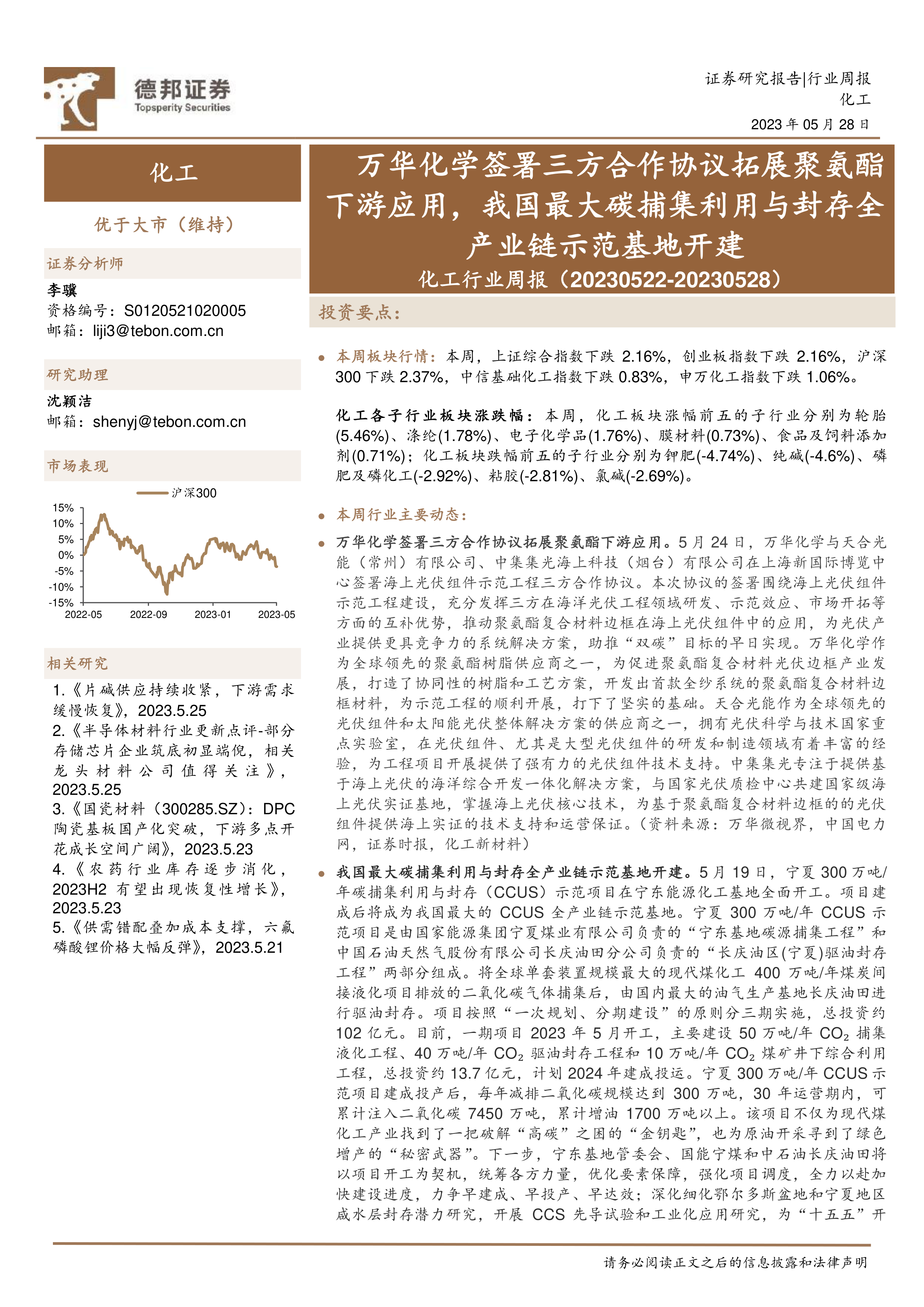 化工行业周报:万华化学签署三方合作协议拓展聚氨酯下游应用,我国最大碳捕集利用与封存全产业链示范基地开建