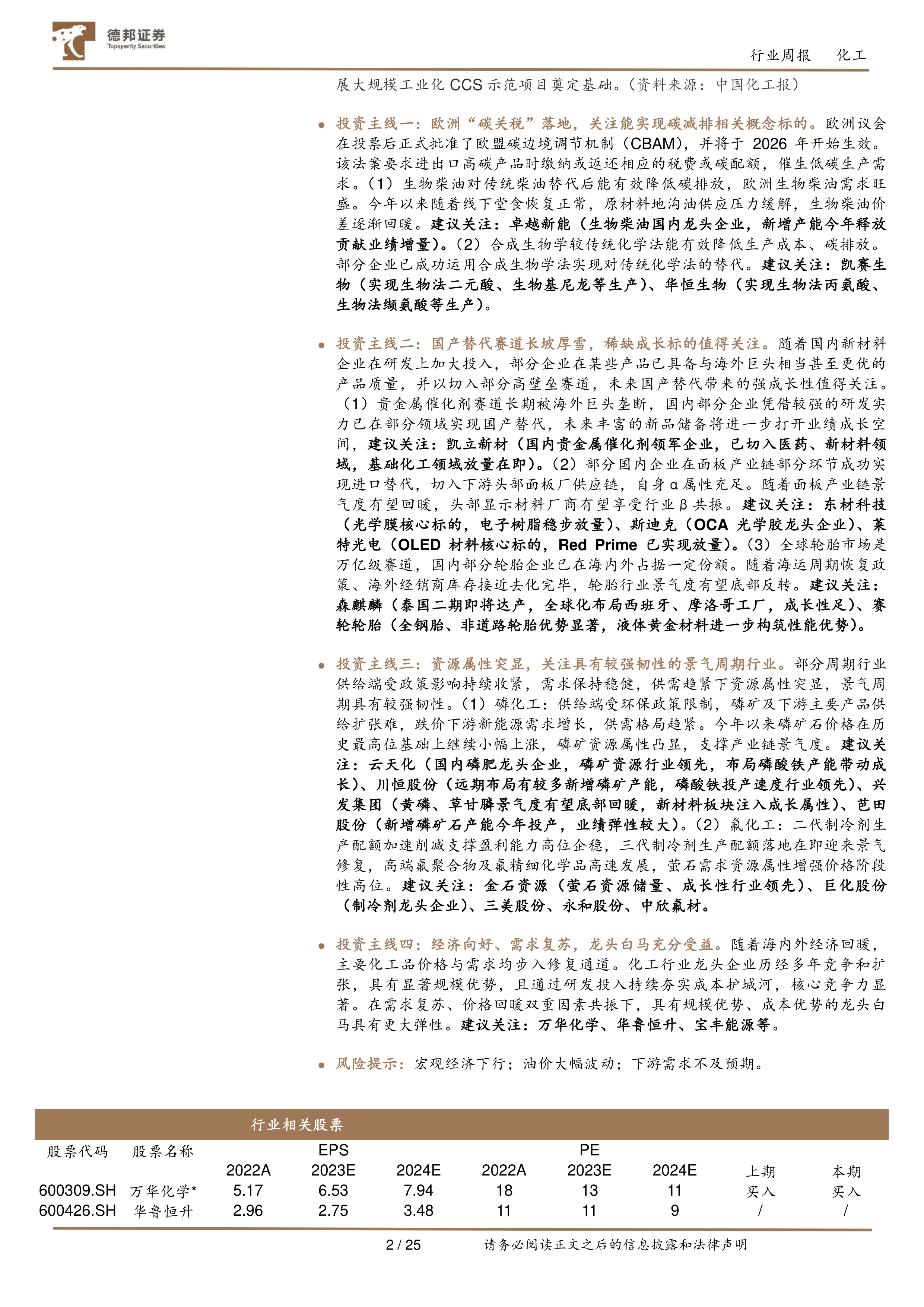 报告提出的四大投资主线为投资者提供了清晰的指引:一是关注欧洲“碳关税”背景下生物柴油和合成生物学等碳减排相关标的;二是把握国内新材料企业在贵金属催化剂、面板材料和轮胎等领域的国产替代机遇;三是布局磷化工和氟化工等资源属性突出、景气周期韧性强的行业;四是关注在经济复苏和需求回暖中具有规模和成本优势的化工龙头白马企业。尽管面临宏观经济下行、油价大幅波动和下游需求不及预期的风险,但通过聚焦绿色转型、技术创新和市场结构性机遇,化工行业仍有望实现高质量发展。