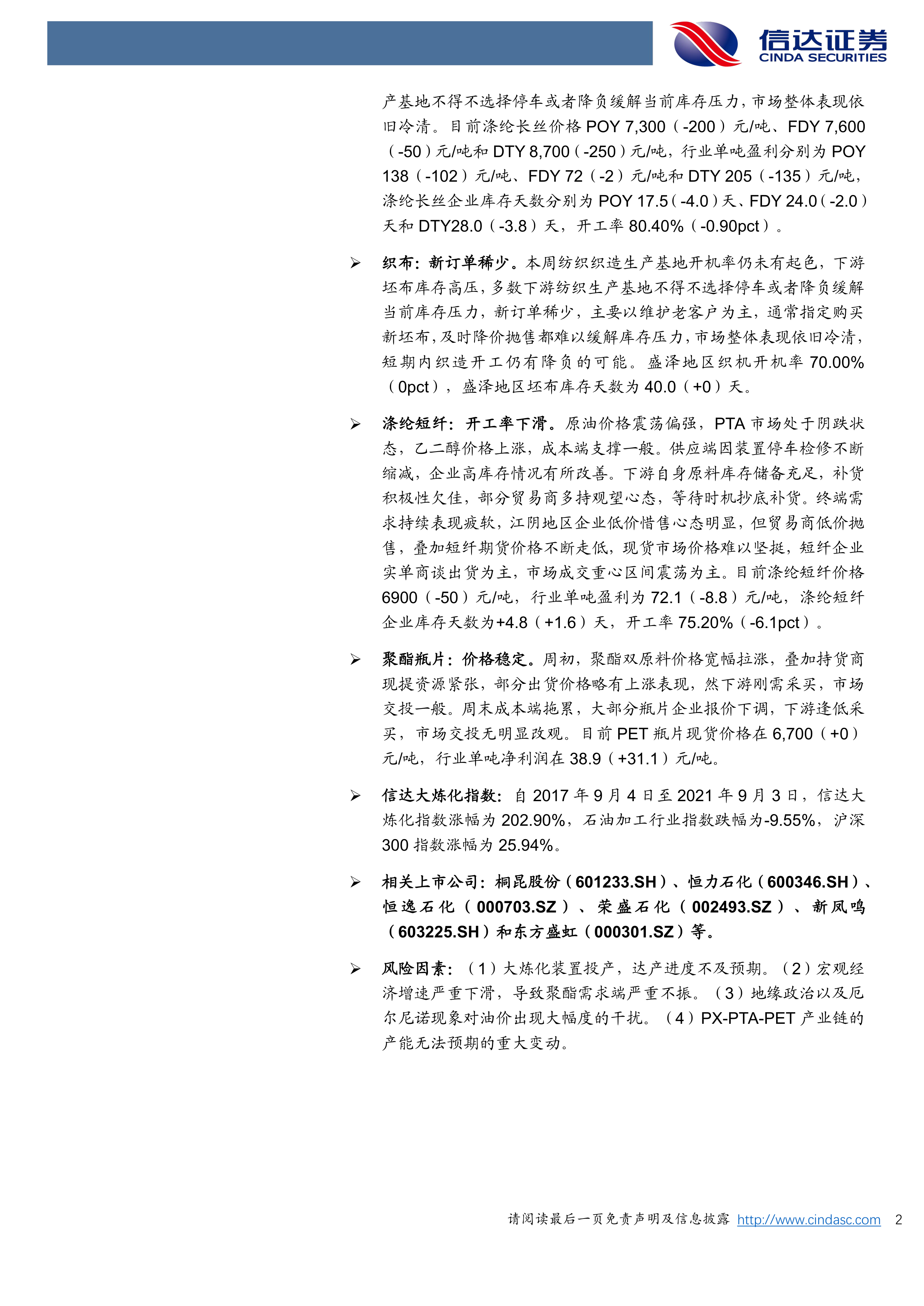 风险因素:(1)大炼化装置投产,达产进度不及预期。(2)宏观经济增速严重下滑,导致聚酯需求端严重不振。(3)地缘政治以及厄尔尼诺现象对油价出现大幅度的干扰。(4)PX-PTA-PET产业链的产能无法预期的重大变动。