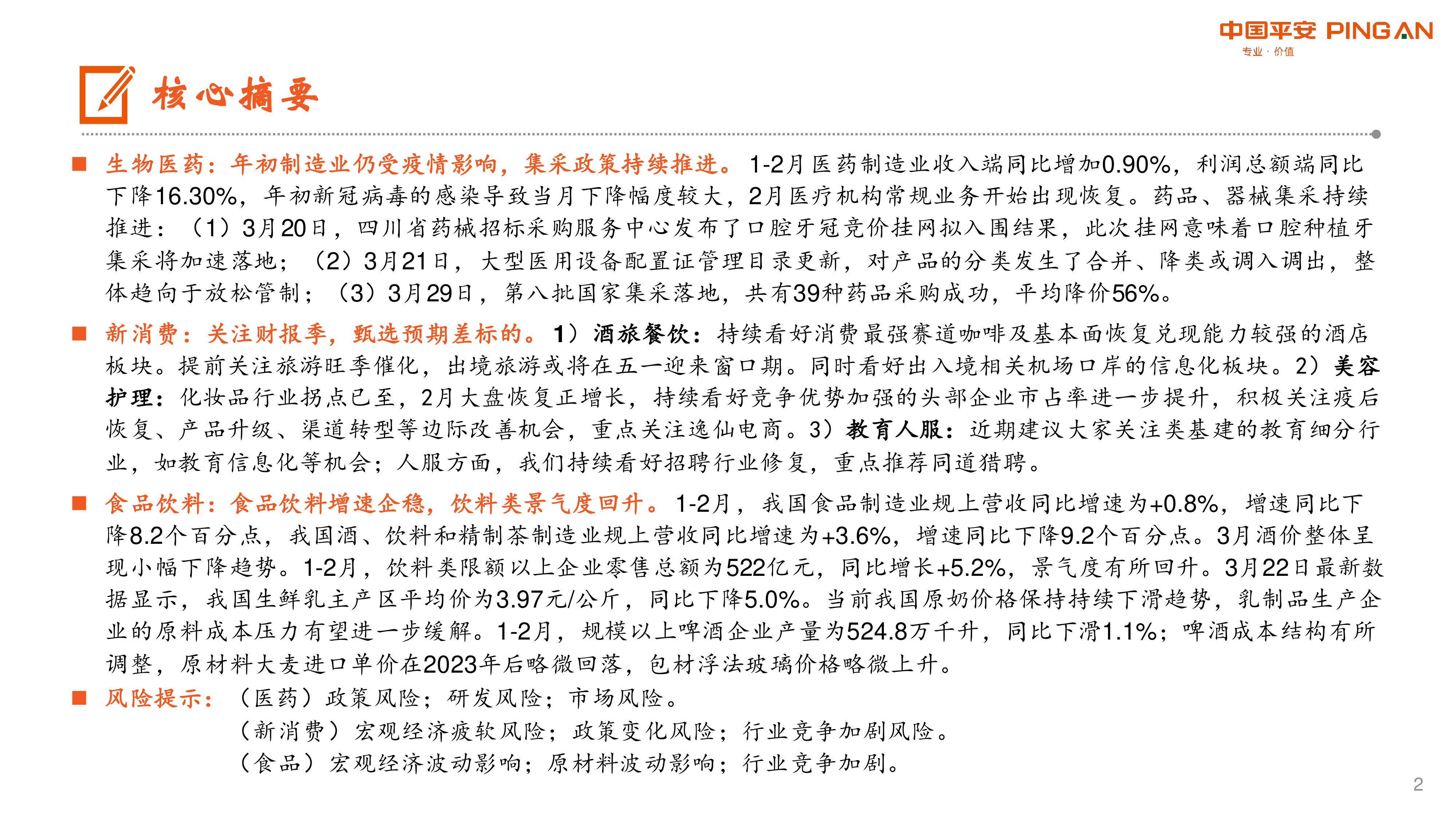 本报告由平安证券研究所医健文旅大消费团队发布,对生物医药、新消费和食品饮料三大行业2023年4月的市场表现和未来趋势进行了分析和展望。