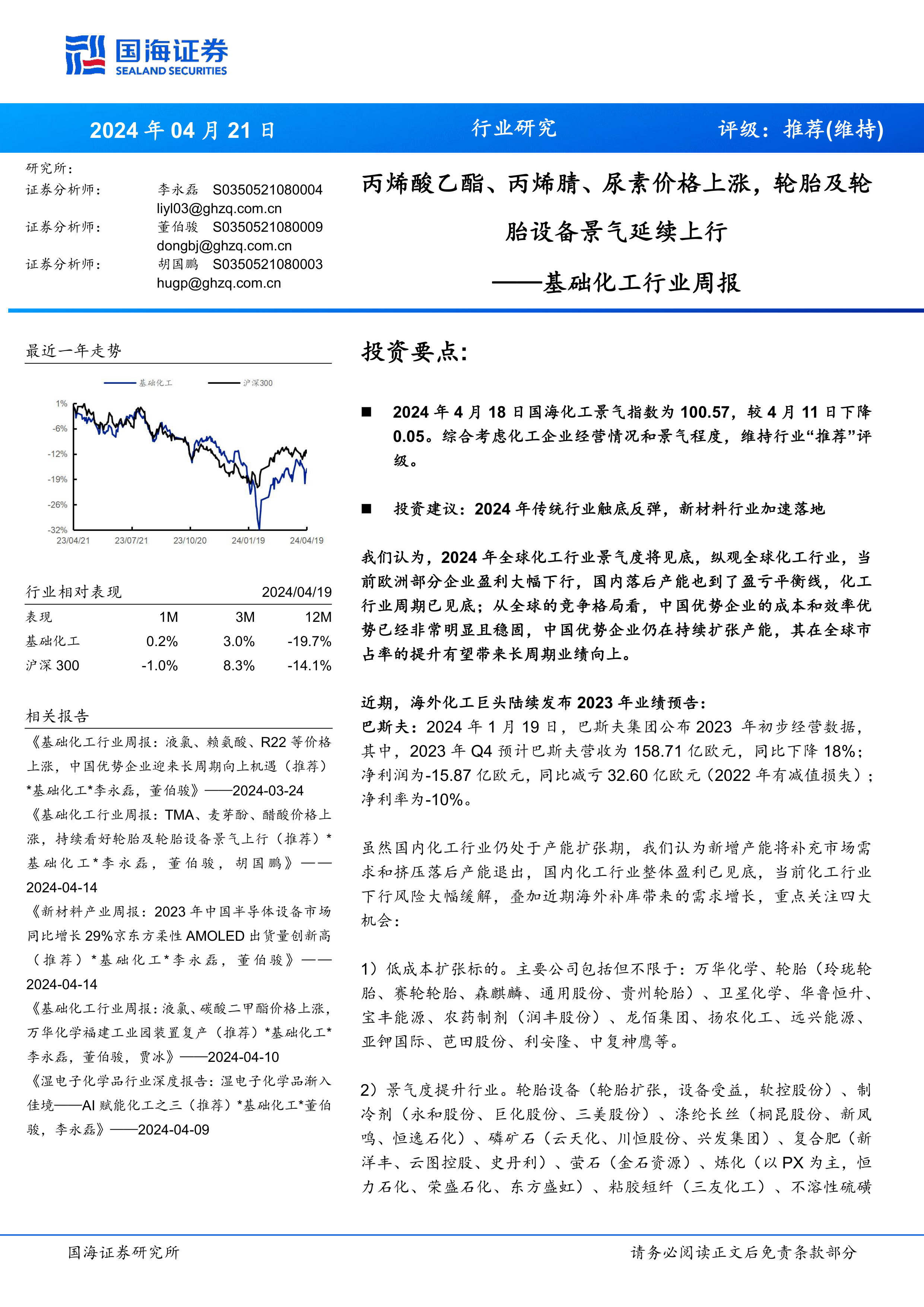 本周基础化工行业景气指数略有下降,但整体维持“推荐”评级,主要基于对全球化工行业景气度触底反弹的判断,以及中国优势企业在全球竞争格局中日益稳固的成本和效率优势。报告详细分析了低成本扩张、景气度提升、新材料和高股息央国企四大投资机会。在市场表现方面,基础化工指数本周及年初至今均跑输沪深300指数。具体产品价格方面,丙烯酸乙酯、丙烯腈和尿素等产品价格上涨,而合成氨、煤焦油和苯胺等产品价格下跌。多家重点关注公司发布了2023年年报或2024年一季报,业绩表现分化,部分公司如森麒麟、国瓷材料实现营收和利润双增长,而另一些公司如巨化股份、长青股份则面临利润下滑。海外化工巨头2023年业绩普遍承压。整体来看,化工行业正处于结构性调整和补库存周期中,细分领域龙头和具备核心竞争优势的企业有望在未来实现长周期向上增长。投资者需关注宏观经济变化、油价波动、环保政策以及产品价格大幅波动等风险。