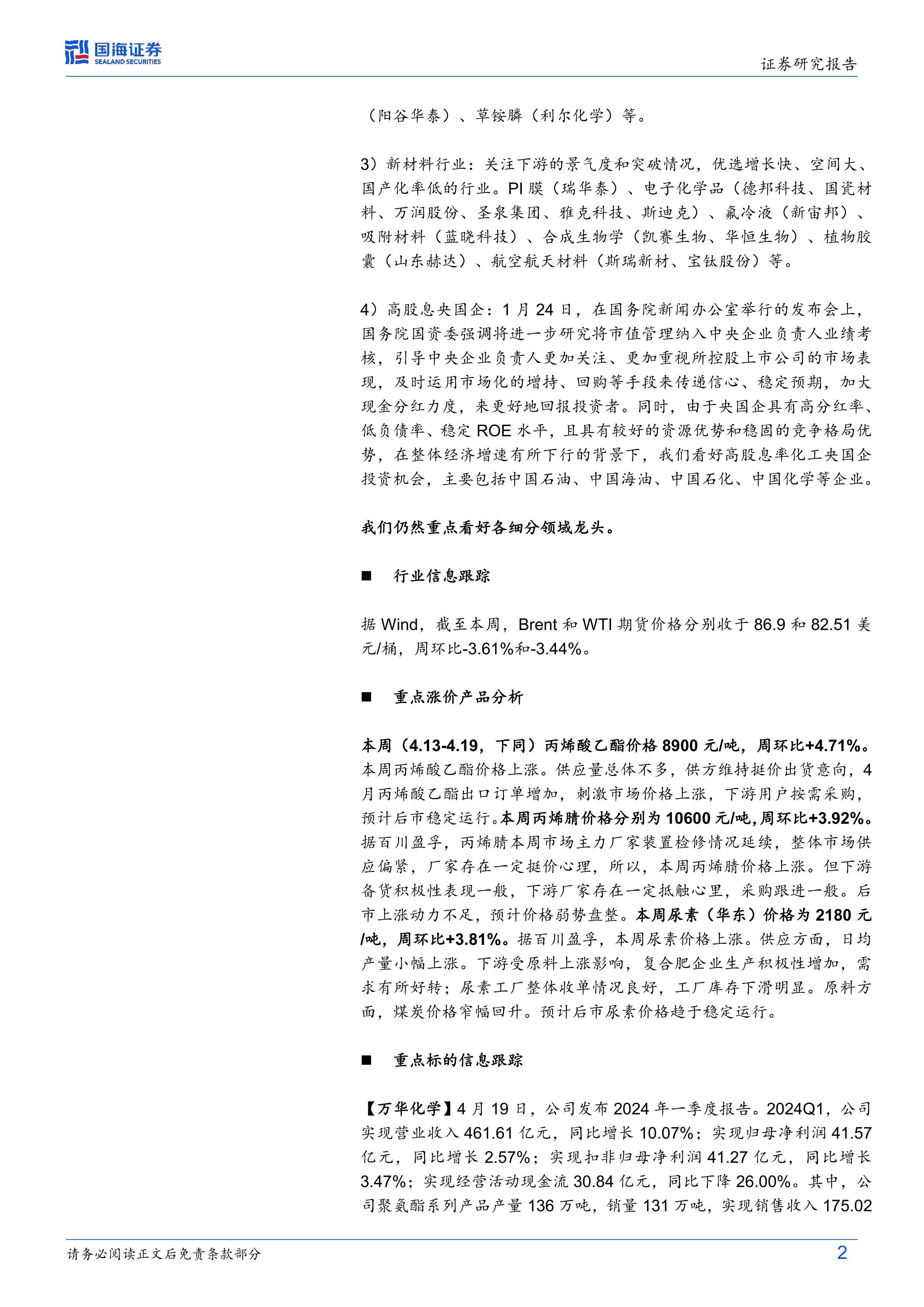 【卫星化学】据Wind,2024年4月19日丙烯酸价格为6500元/吨,环比4月12日下降100元/吨。