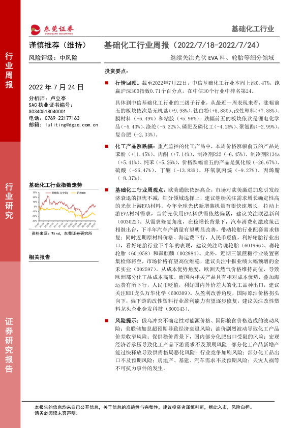 行情回顾。截至2022年7月22日,中信基础化工行业本周上涨0.47%,跑赢沪深300指数0.71个百分点,在中信30个行业中排名第24。