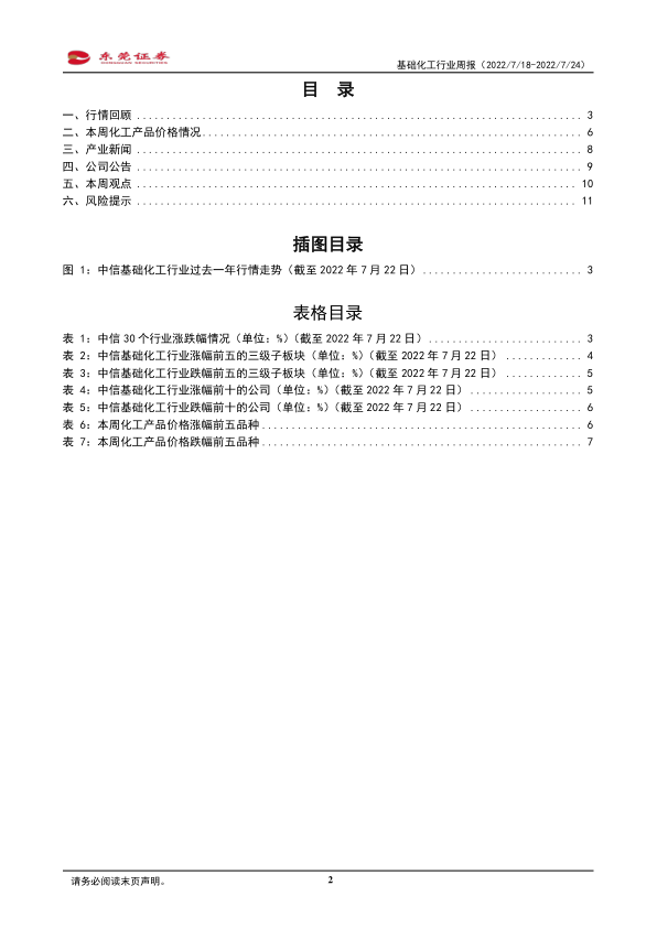 风险提示:俄乌冲突不确定性对能源价格、国际粮食价格造成的波动风险;美联储加息超预期导致经济衰退风险;油价剧烈波动导致化工产品价差收窄风险;保供稳价背景下,国内部分化肥出口受限的风险;宏观经济若承压导致化工产品下游需求不及预期风险;部分化工产品新增产能过快释放导致供需格局恶化风险;行业竞争加剧风险;部分化工品出口不及预期风险;房地产、基建、汽车需求不及预期风险;天灾人祸等不可抗力事件的发生。