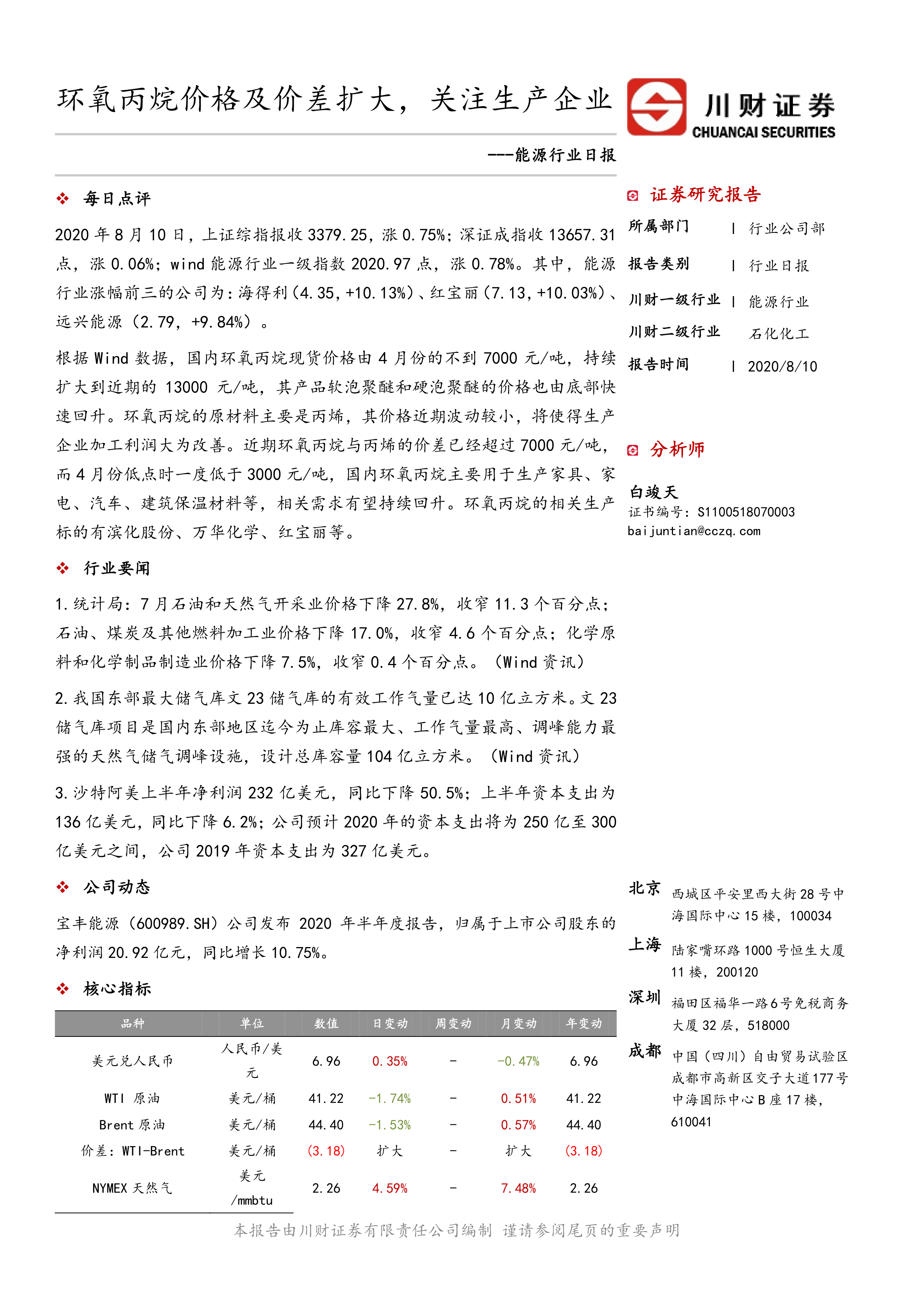 能源行业日报:环氧丙烷价格及价差扩大,关注生产企业