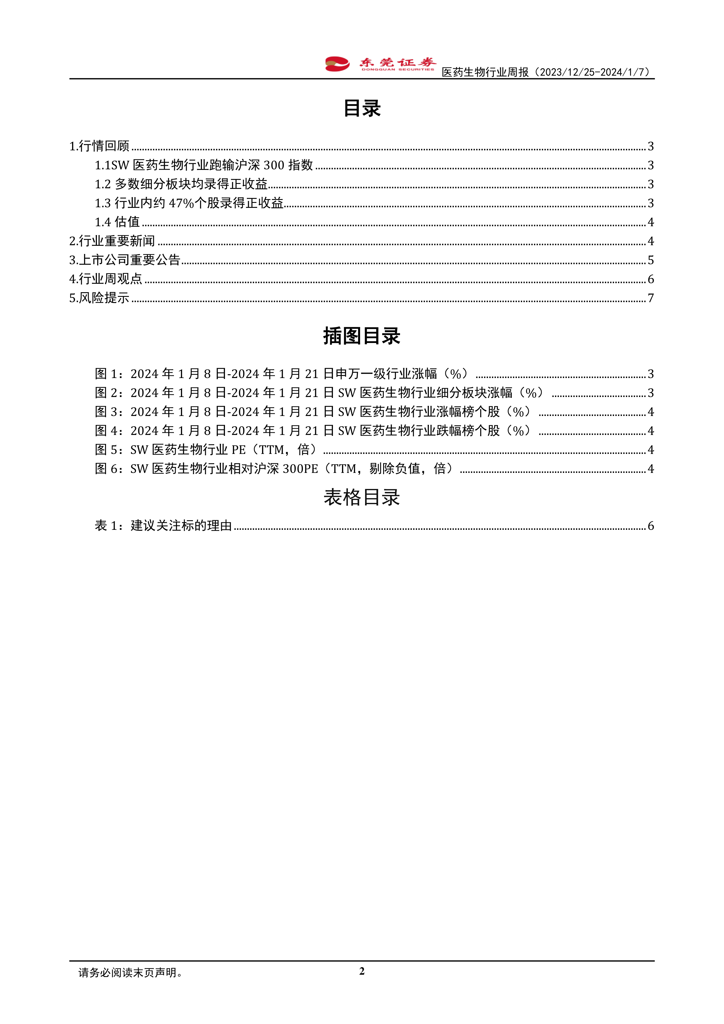 本报告分析了2024年1月8日至2024年1月21日期间医药生物行业的市场表现,并对行业未来投资机会提出建议。