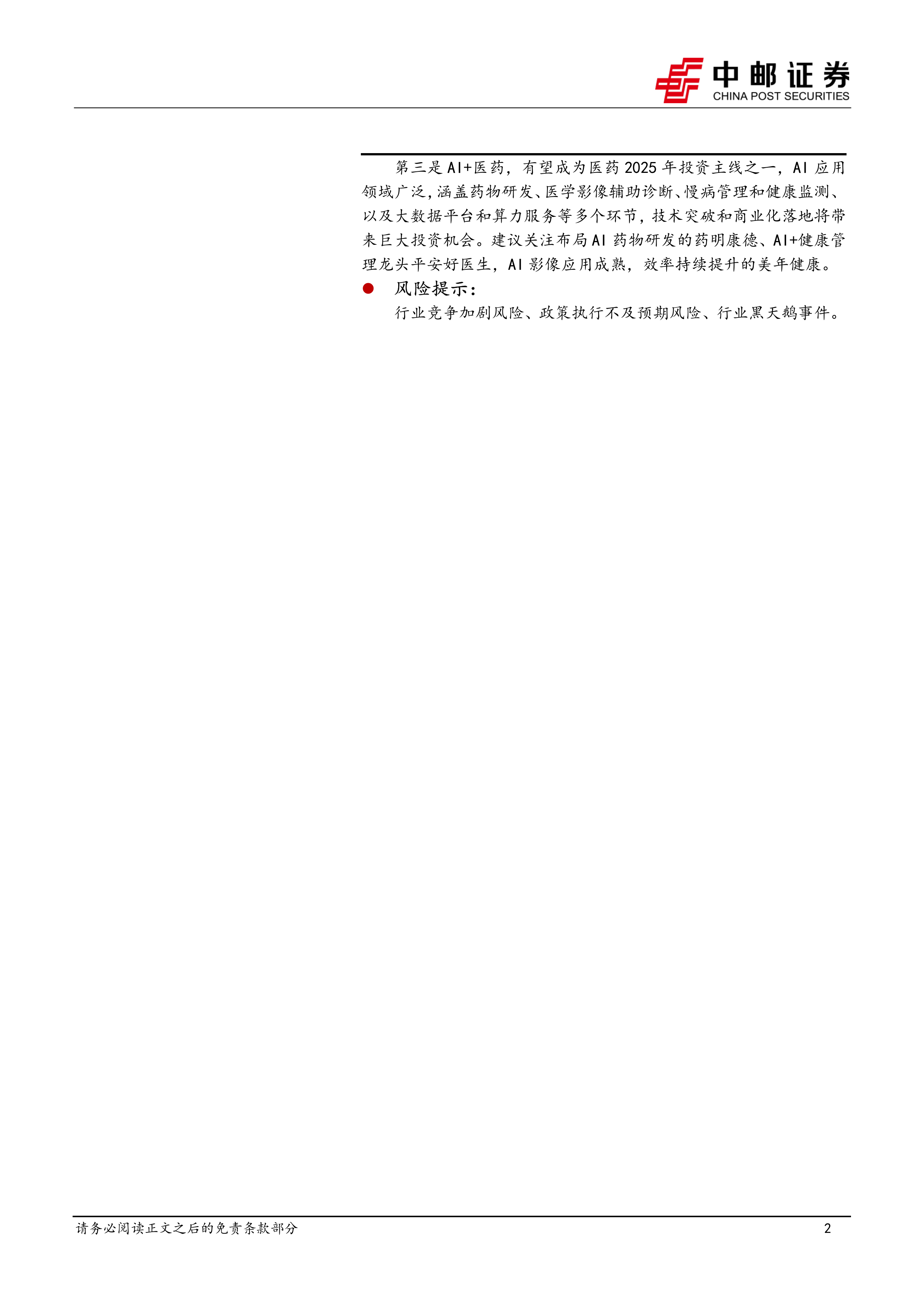 第三是AI+医药,有望成为医药2025年投资主线之一,AI应用领域广泛,涵盖药物研发、医学影像辅助诊断、慢病管理和健康监测、以及大数据平台和算力服务等多个环节,技术突破和商业化落地将带来巨大投资机会。建议关注布局AI药物研发的药明康德、AI+健康管理龙头平安好医生,AI影像应用成熟,效率持续提升的美年健康。