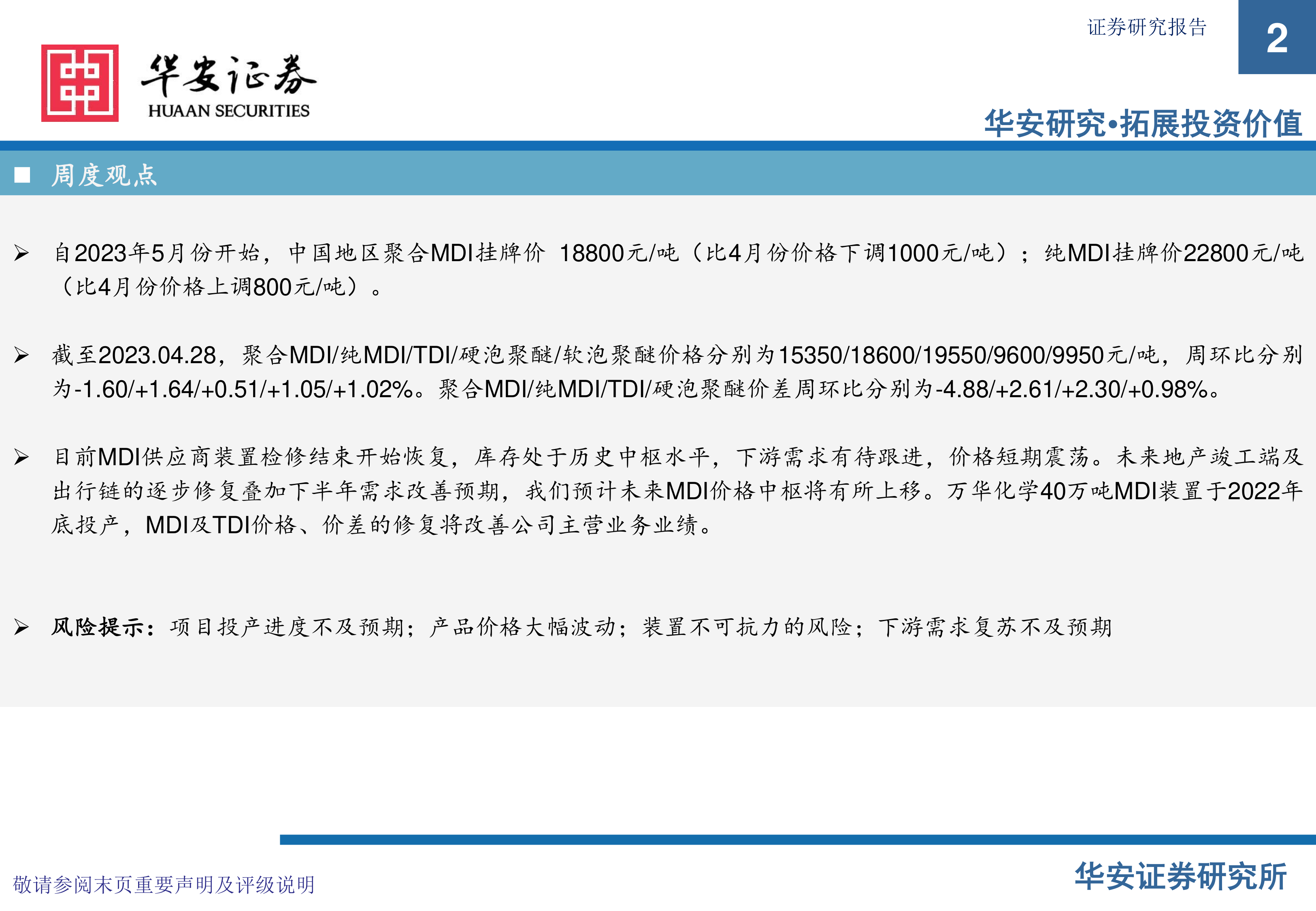 本报告核心观点指出,2023年5月中国地区MDI挂牌价呈现波动,其中聚合MDI价格下调1000元/吨至18800元/吨,而纯MDI价格上调800元/吨至22800元/吨。截至4月28日,聚合MDI价格周环比下降1.60%,纯MDI价格周环比上涨1.64%。尽管MDI供应商装置检修已结束并恢复生产,库存处于历史中枢水平,但下游需求仍有待跟进,导致短期价格震荡。展望未来,随着房地产竣工端和出行链的逐步修复,叠加下半年需求改善预期,预计MDI价格中枢将有所上移。