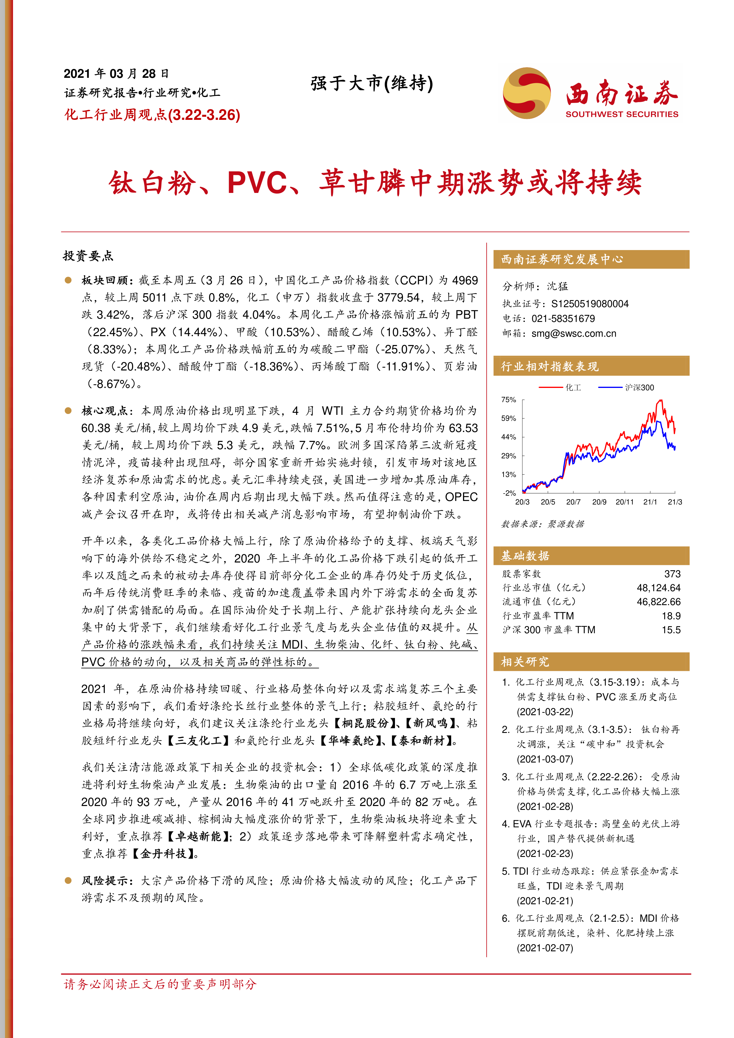 本报告核心观点指出,在原油价格持续回暖、行业格局整体向好以及需求端全面复苏的三重驱动下,化工行业景气度持续上行,并预计龙头企业估值将实现双提升。尽管本周原油价格因欧洲疫情和美元走强而下跌,但OPEC减产会议预期有望抑制跌势,且年初以来化工品价格大幅上涨,主要得益于原油支撑、海外供给不稳定、低库存以及下游需求的全面复苏,导致供需错配加剧。