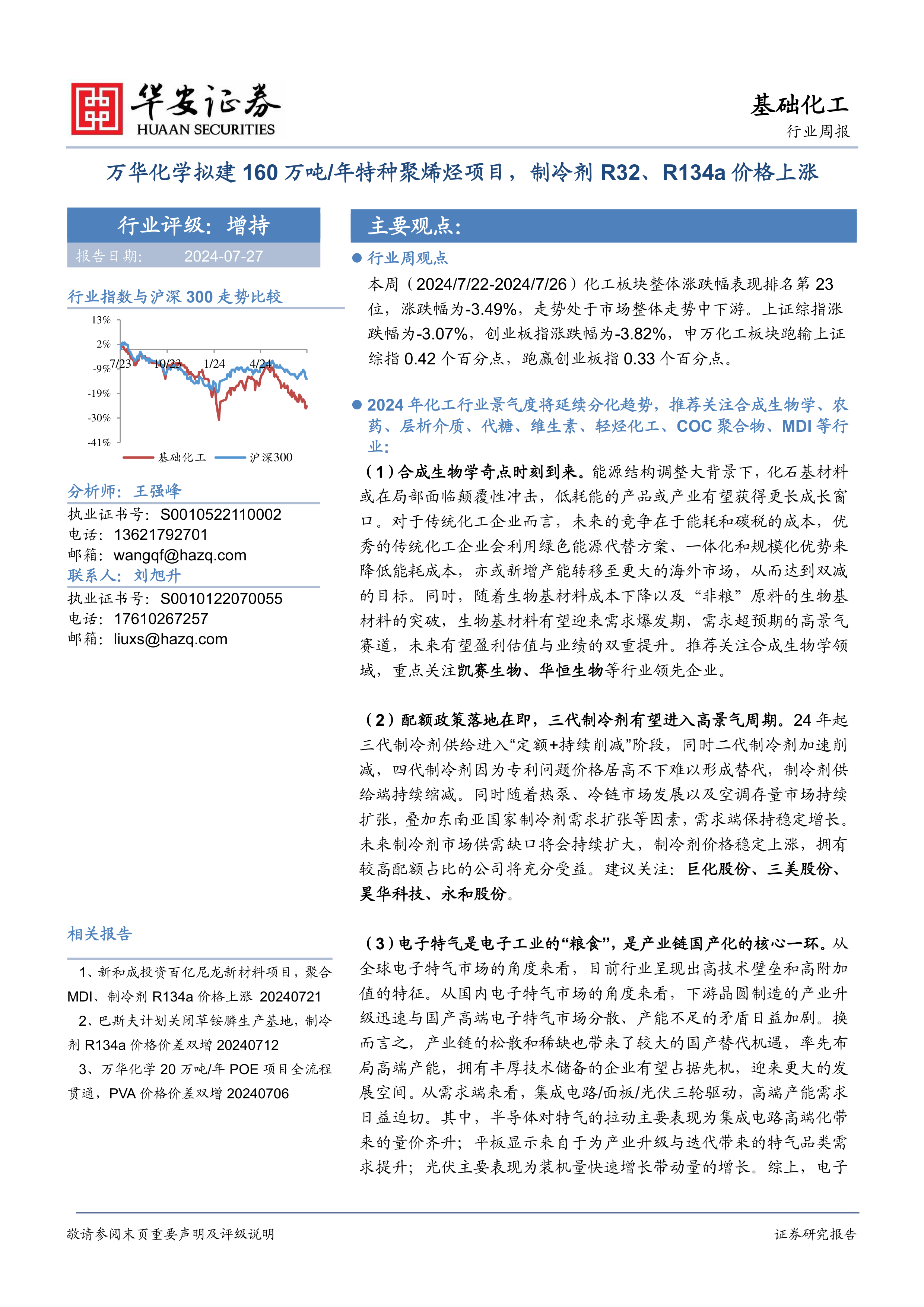 基础化工行业周报:万华化学拟建160万吨/年特种聚烯烃项目,制冷剂R32、R134a价格上涨