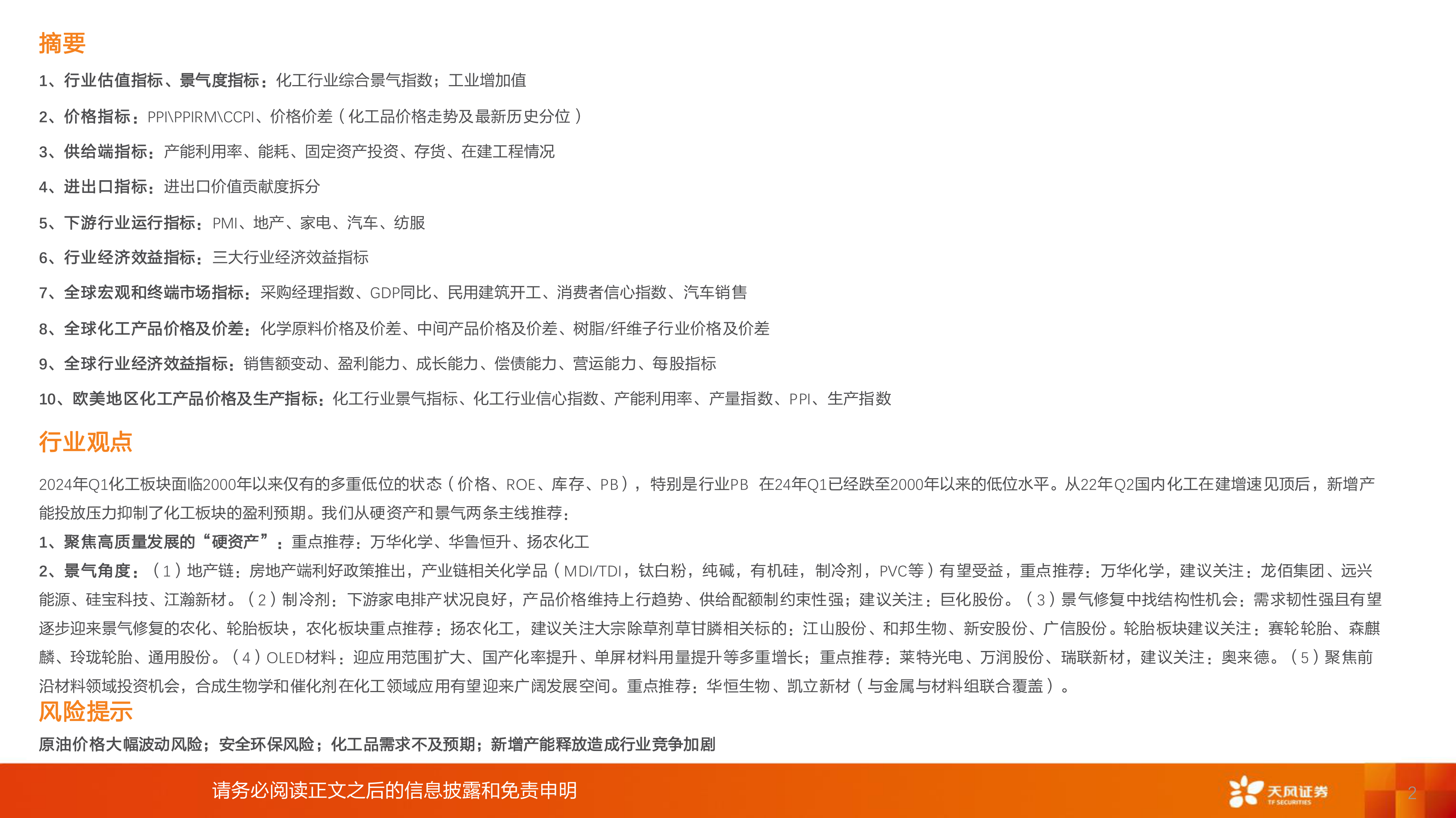 最后,报告提示了原油价格波动、安全环保、需求不及预期以及新增产能竞争加剧等主要风险。总体而言,化工行业在经历低谷后正逐步迎来结构性修复,投资者应关注高质量“硬资产”和景气修复下的细分领域投资机会。