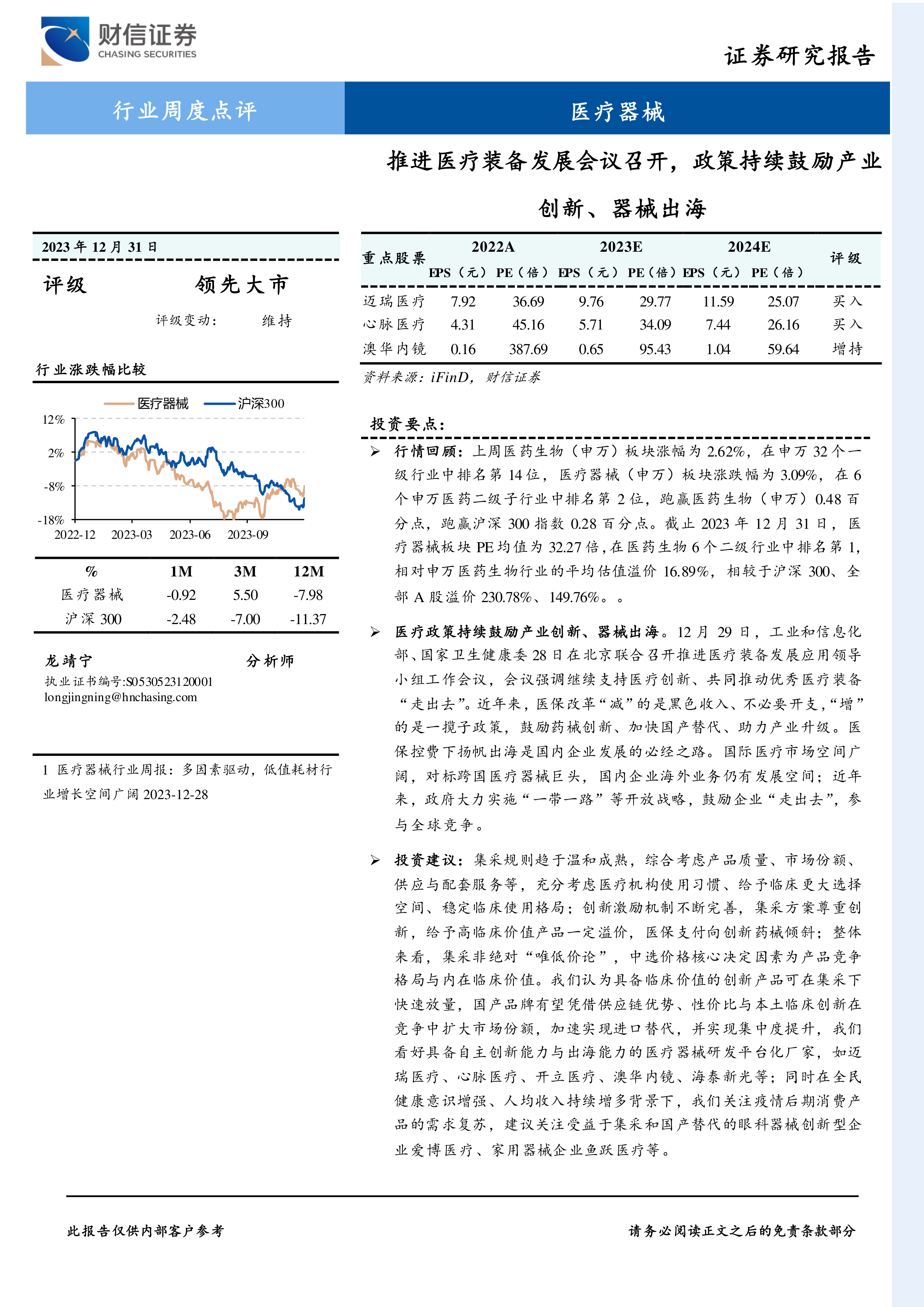 医疗器械行业周度点评:推进医疗装备发展会议召开,政策持续鼓励产业创新、器械出海