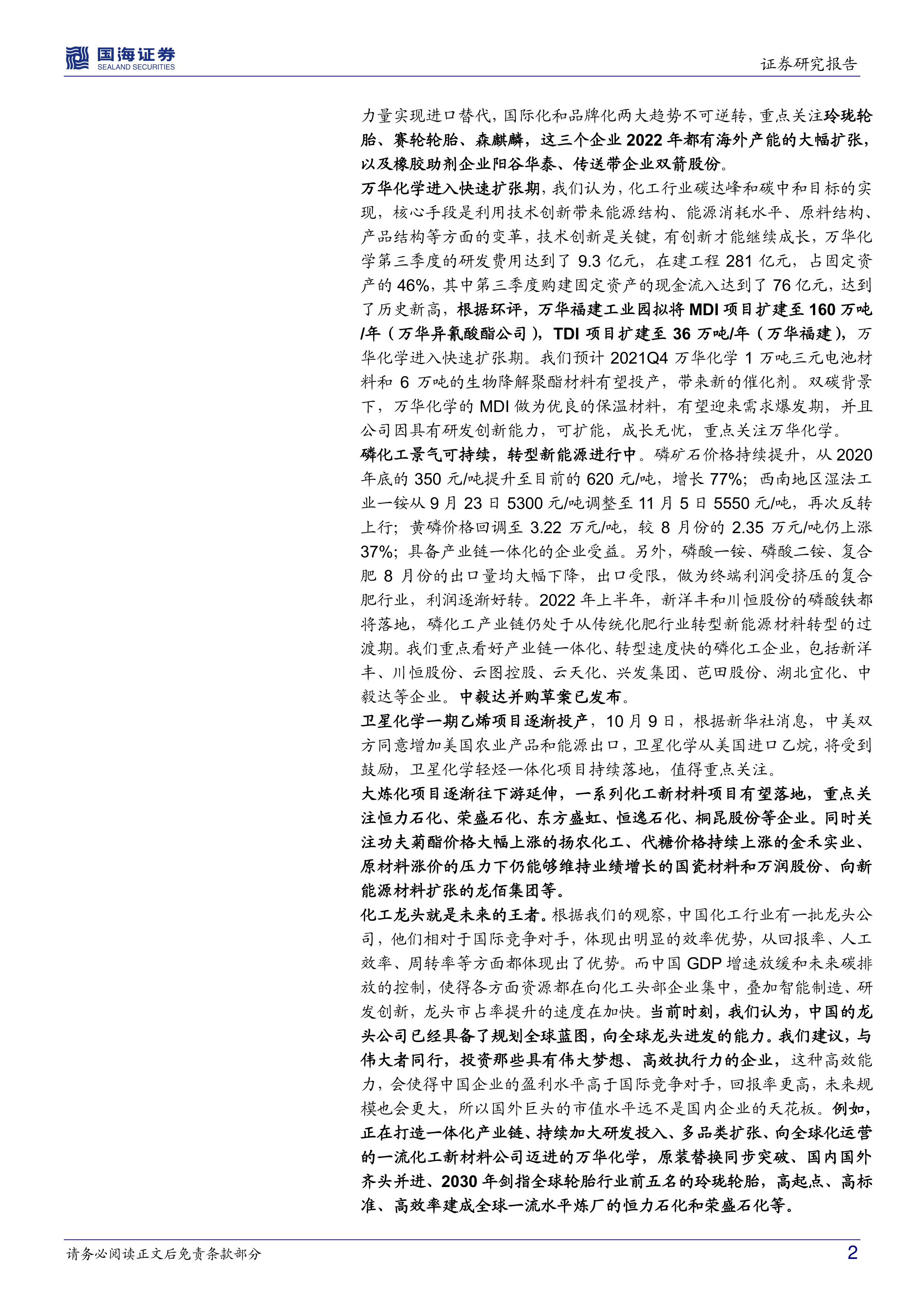 报告认为,化工行业上游景气度高企,下游行业此前受到严重挤压,但展望未来一年,下游行业有望触底反转,主要驱动因素包括原材料价格下降或成本压力向下游传导,从而带来利润提升。报告重点推荐布局产能可扩张的标的以及下游行业业绩反转的标的。具体来看,轮胎行业预计在2021年第三季度触底,第四季度和2022年第一季度利润将好转,得益于供给收缩、海运费松动及需求回暖。万华化学、磷化工、卫星化学等细分领域龙头企业正通过技术创新和大规模扩产,积极布局新能源材料等高附加值领域,以应对“双碳”挑战并抓住新的增长机遇。报告还特别强调了中国化工龙头企业相对于国际竞争对手的效率优势,认为它们已具备规划全球蓝图、向全球龙头进发的能力,建议投资者与这些具有伟大梦想和高效执行力的企业同行。