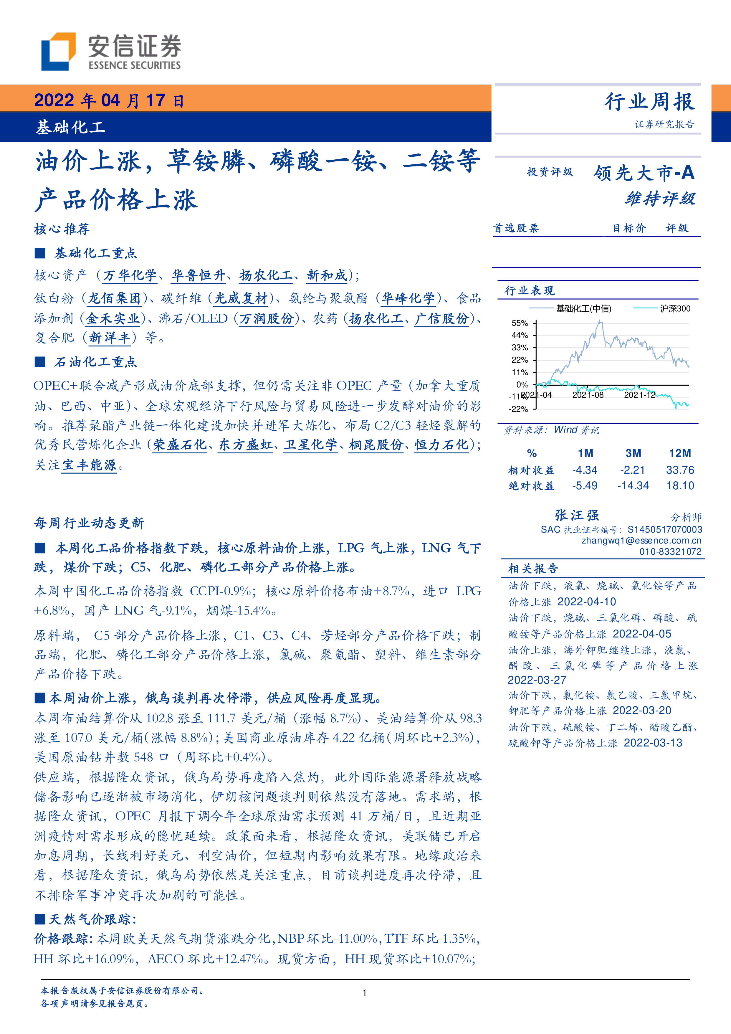 本周(2022年4月17日)基础化工行业(中信)在短期内(1个月、3个月)相对沪深300指数分别录得-4.34%和-2.21%的相对收益,绝对收益分别为-5.49%和-14.34%。然而,从12个月的长期视角来看,基础化工行业表现强劲,相对收益高达33.76%,绝对收益为18.10%,显示出其长期投资价值。