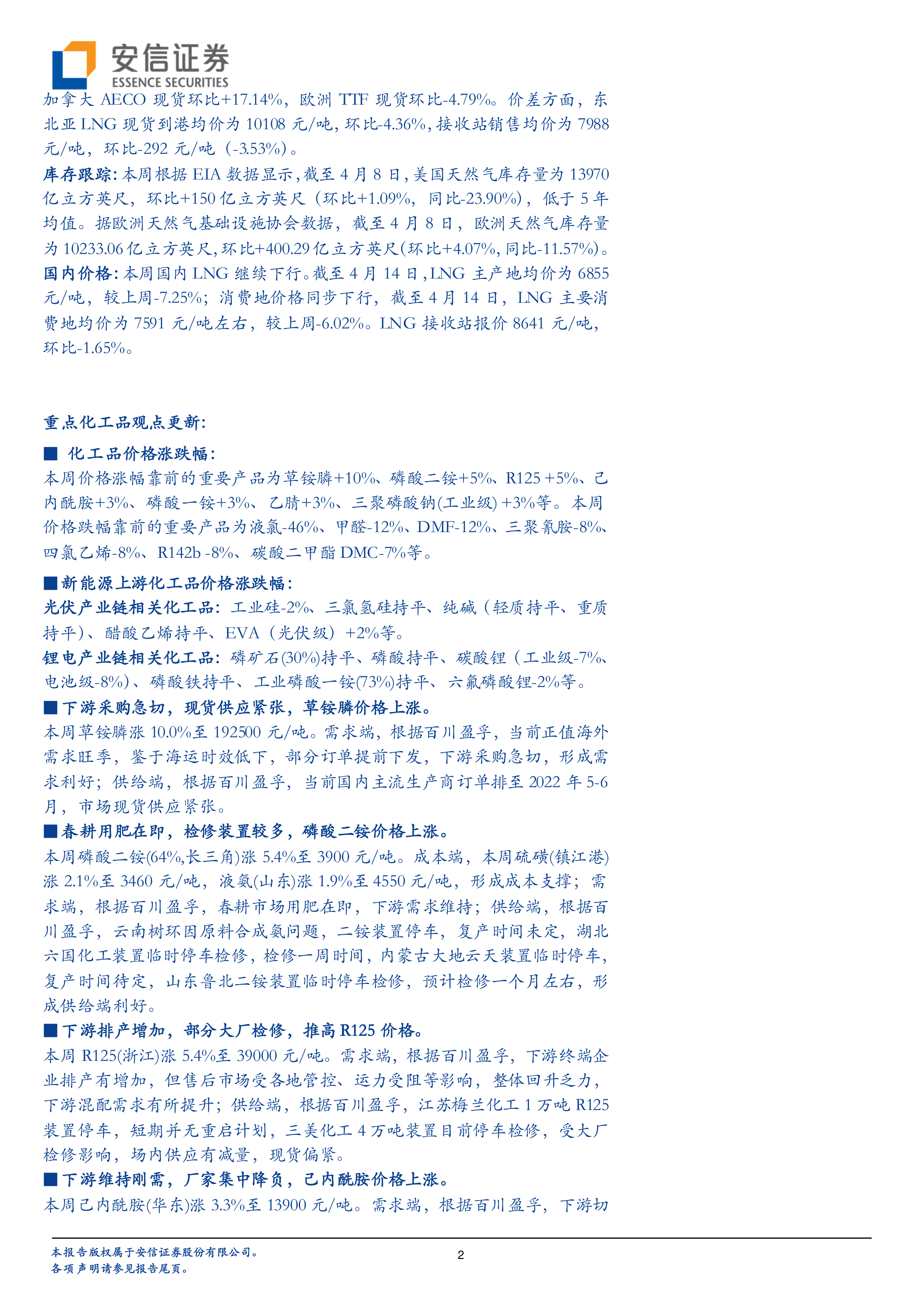 本报告深入分析了油价、天然气价及多种重点化工品的价格变动及其驱动因素。油价受俄乌局势焦灼、IEA战略储备影响消化及OPEC下调需求预测等多重因素影响,本周显著上涨。天然气价格则呈现欧美涨跌分化、国内持续下行的趋势。对于草铵膦、磷酸二铵、R125、己内酰胺和磷酸一铵等价格上涨的产品,报告详细阐述了其背后的供需紧张、成本推动、装置检修以及物流受阻等具体原因,展现了市场供需关系的动态平衡。