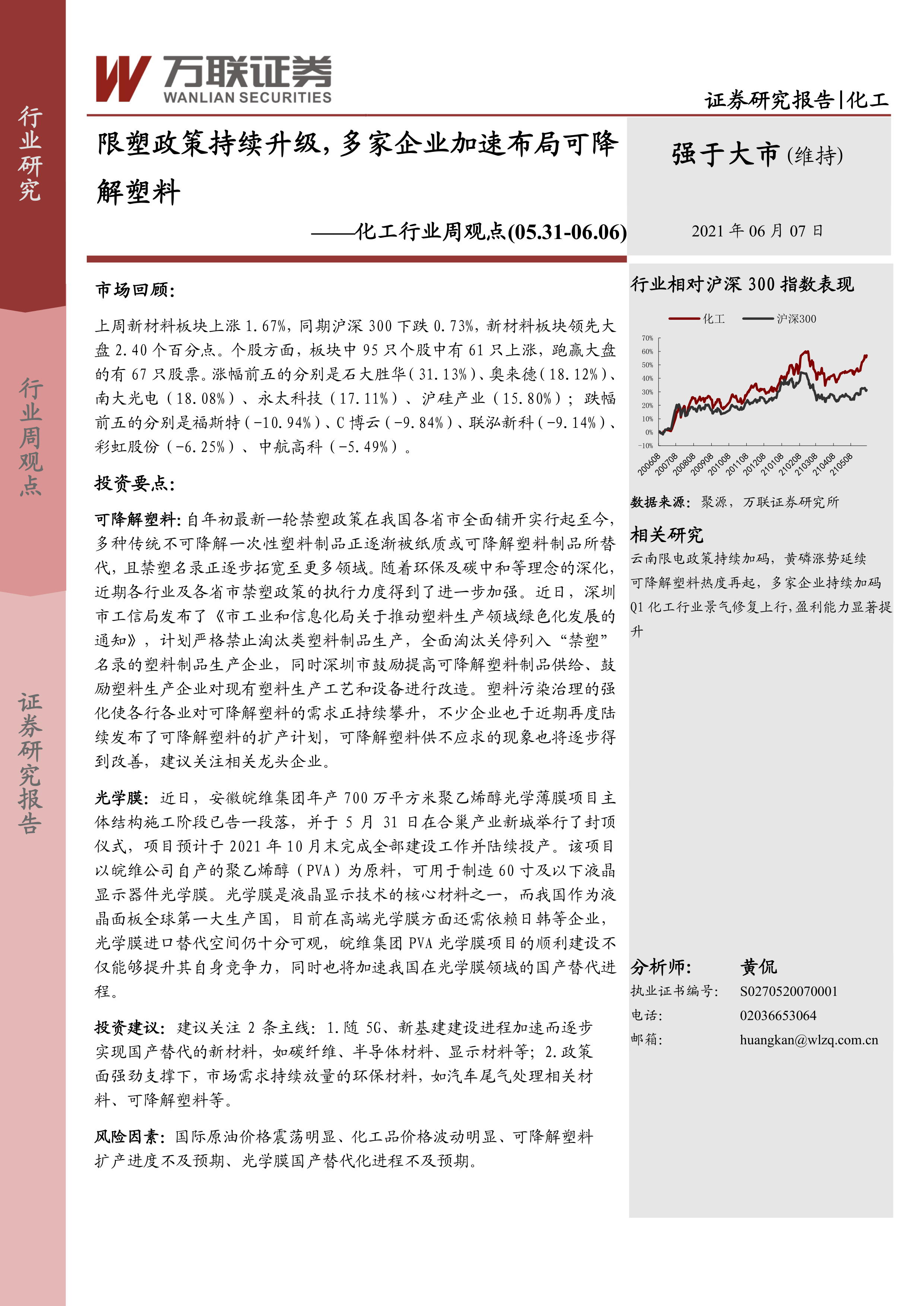 风险因素:国际原油价格震荡明显、化工品价格波动明显、可降解塑料扩产进度不及预期、光学膜国产替代化进程不及预期