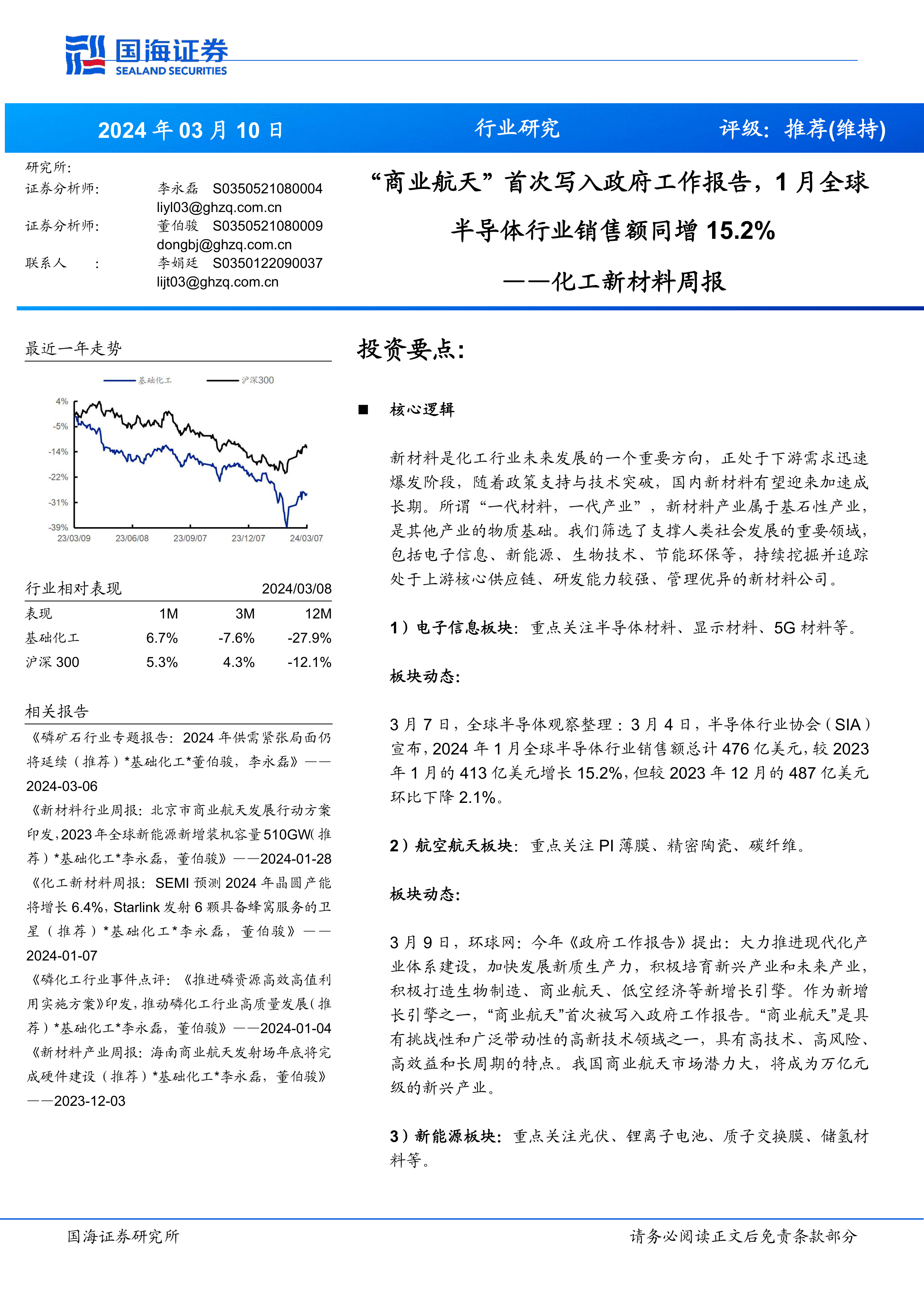 化工新材料周报:“商业航天”首次写入政府工作报告,1月全球半导体行业销售额同增15.2%