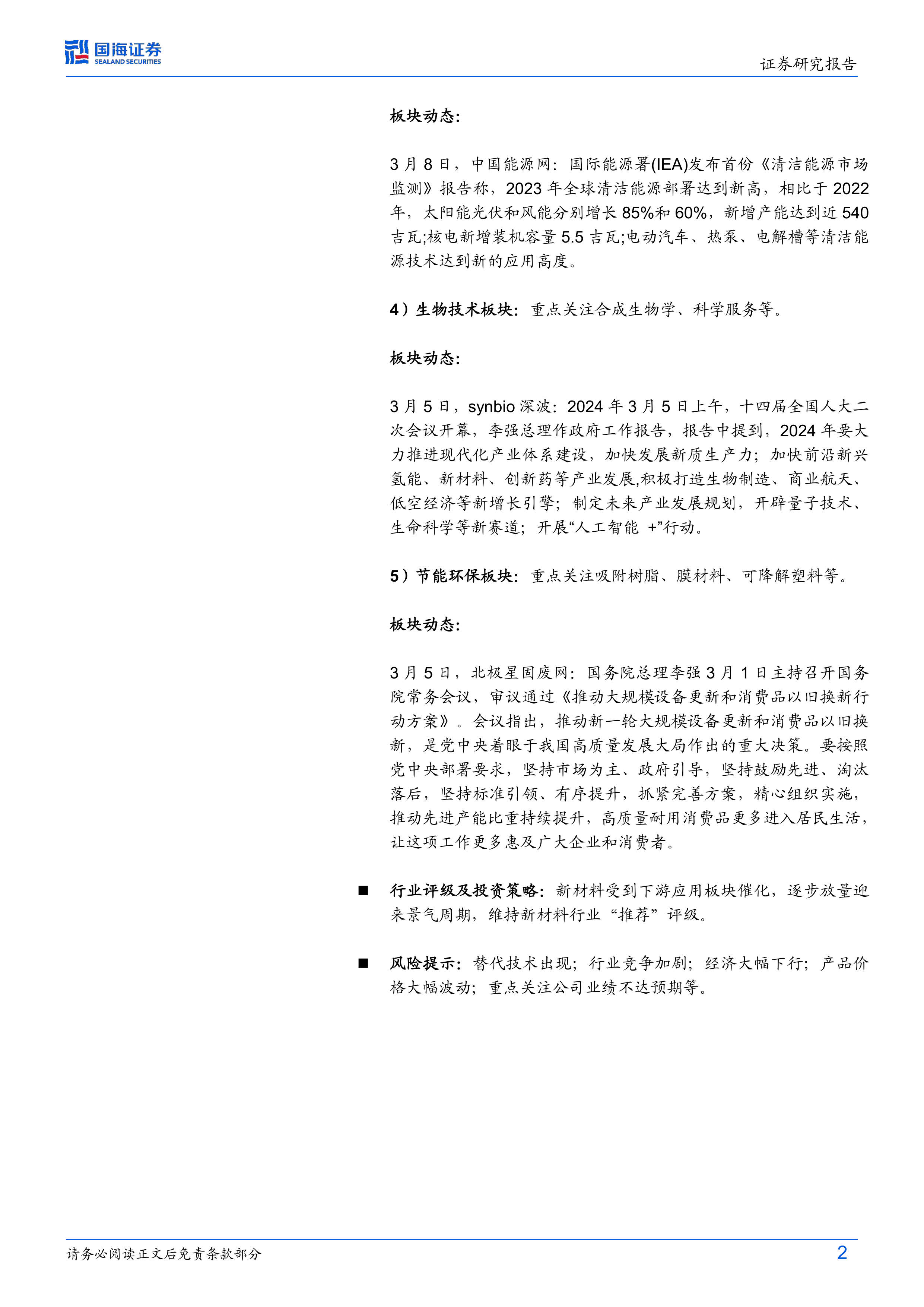 3月5日,synbio深波:2024年3月5日上午,十四届全国人大二次会议开幕,李强总理作政府工作报告,报告中提到,2024年要大力推进现代化产业体系建设,加快发展新质生产力;加快前沿新兴氢能、新材料、创新药等产业发展,积极打造生物制造、商业航天、低空经济等新增长引擎;制定未来产业发展规划,开辟量子技术、生命科学等新赛道;开展“人工智能+”行动。