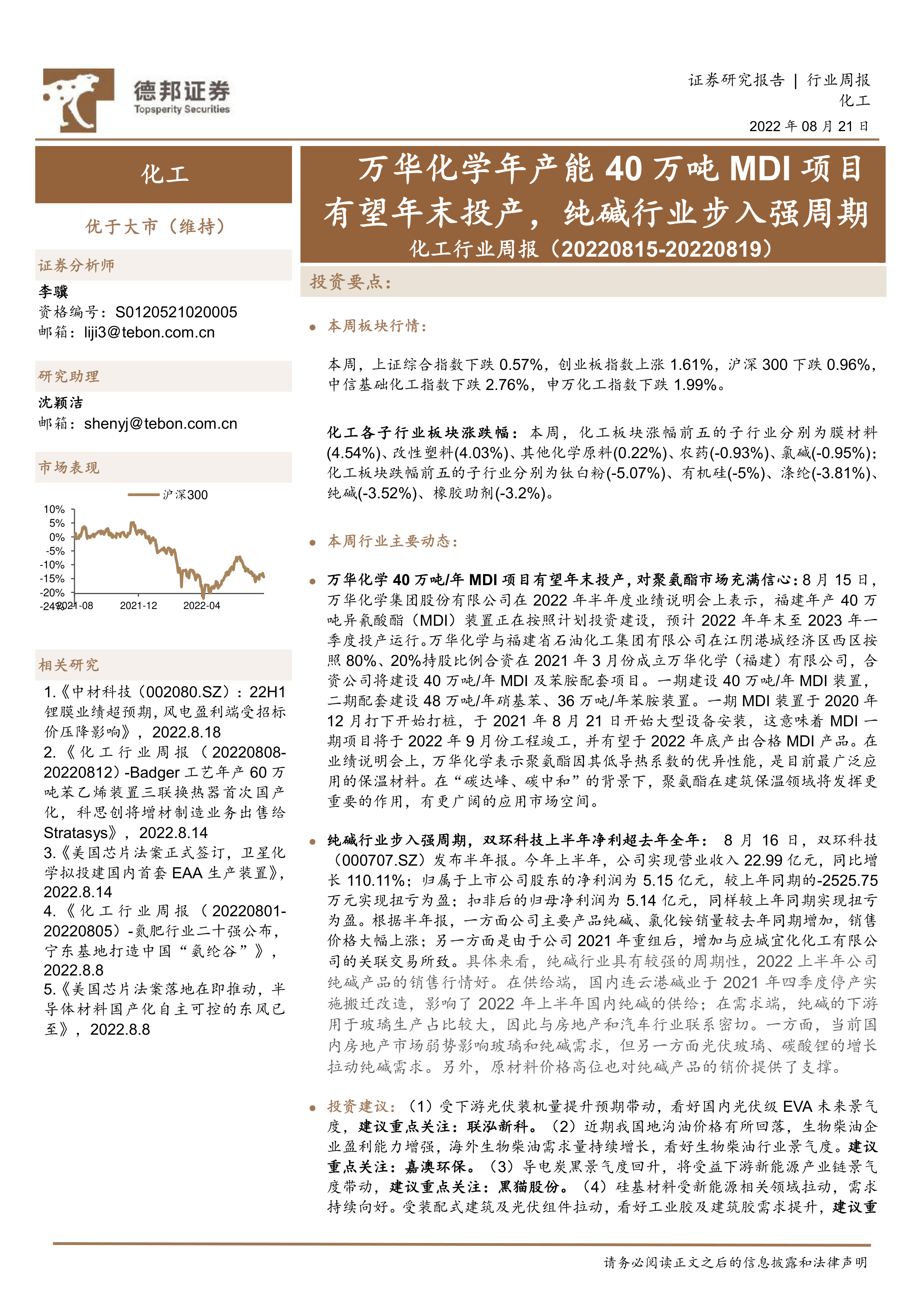 重点公司动态方面,万华化学宣布其福建年产40万吨MDI项目预计在2022年末至2023年一季度投产,该项目将进一步巩固公司在聚氨酯市场的领先地位,并看好聚氨酯在“碳达峰、碳中和”背景下建筑保温领域的广阔应用前景。双环科技上半年实现营业收入22.99亿元,同比增长110.11%;归属于上市公司股东的净利润达5.15亿元,成功实现扭亏为盈(去年同期为-2525.75万元),主要得益于纯碱、氯化铵产品销量和价格的大幅上涨,以及连云港碱业停产、光伏玻璃和碳酸锂需求增长对纯碱行业的拉动。此外,华恒生物、皇马科技、金丹科技等公司也发布了亮眼的半年度业绩报告,显示出较强的盈利能力和增长势头。远兴能源拟发行不超过10亿元债权融资计划,用于收购内蒙古博远银根矿业14%股权,以满足资金需求并拓宽融资渠道。山东海化通过全资子公司参股设立山东液流海材料科技有限公司,旨在进一步延展产业链条,加快产业升级。