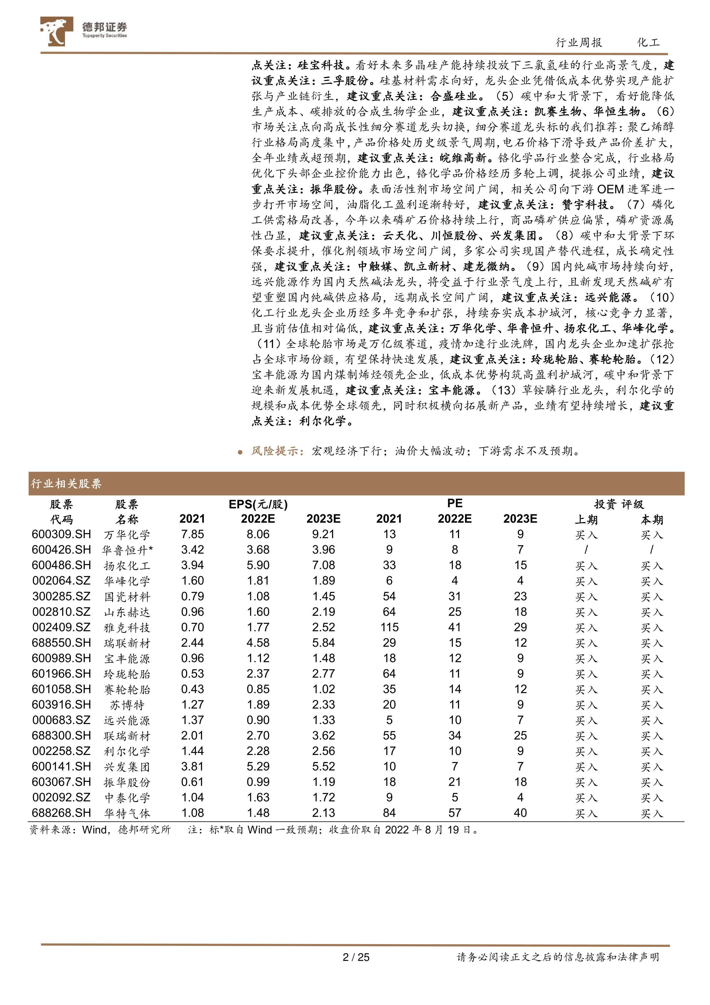投资建议:(1)受下游光伏装机量提升预期带动,看好国内光伏级EVA未来景气度,建议重点关注:联泓新科。(2)近期我国地沟油价格有所回落,生物柴油企业盈利能力增强,海外生物柴油需求量持续增长,看好生物柴油行业景气度。建议重点关注:嘉澳环保。(3)导电炭黑景气度回升,将受益下游新能源产业链景气度带动,建议重点关注:黑猫股份。(4)硅基材料受新能源相关领域拉动,需求持续向好。受装配式建筑及光伏组件拉动,看好工业胶及建筑胶需求提升,建议重点关注:硅宝科技。看好未来多晶硅产能持续投放下三氯氢硅的行业高景气度,建议重点关注:三孚股份。硅基材料需求向好,龙头企业凭借低成本优势实现产能扩张与产业链衍生,建议重点关注:合盛硅业。(5)碳中和大背景下,看好能降低生产成本、碳排放的合成生物学企业,建议重点关注:凯赛生物、华恒生物。(6)市场关注点向高成长性细分赛道龙头切换,细分赛道龙头标的我们推荐:聚乙烯醇行业格局高度集中,产品价格处历史级景气周期,电石价格下滑导致产品价差扩大,全年业绩或超预期,建议重点关注:皖维高新。铬化学品行业整合完成,行业格局优化下头部企业控价能力出色,铬化学品价格经历多轮上调,提振公司业绩,建议重点关注:振华股份。表面活性剂市场空间广阔,相关公司向下游OEM进军进一步打开市场空间,油脂化工盈利逐渐转好,建议重点关注:赞宇科技。(7)磷化工供需格局改善,今年以来磷矿石价格持续上行,商品磷矿供应偏紧,磷矿资源属性凸显,建议重点关注:云天化、川恒股份、兴发集团。(8)碳中和大背景下环保要求提升,催化剂领域市场空间广阔,多家公司实现国产替代进程,成长确定性强,建议重点关注:中触媒、凯立新材、建龙微纳。(9)国内纯碱市场持续向好,远兴能源作为国内天然碱法龙头,将受益于行业景气度上行,且新发现天然碱矿有望重塑国内纯碱供应格局,远期成长空间广阔,建议重点关注:远兴能源。(10)化工行业龙头企业历经多年竞争和扩张,持续夯实成本护城河,核心竞争力显著,且当前估值相对偏低,建议重点关注:万华化学、华鲁恒升、扬农化工、华峰化学。(11)全球轮胎市场是万亿级赛道,疫情加速行业洗牌,国内龙头企业加速扩张抢占全球市场份额,有望保持快速发展,建议重点关注:玲珑轮胎、赛轮轮胎。(12)宝丰能源为国内煤制烯烃领先企业,低成本优势构筑高盈利护城河,碳中和背景下迎来新发展机遇,建议重点关注:宝丰能源。(13)草铵膦行业龙头,利尔化学的规模和成本优势全球领先,同时积极横向拓展新产品,业绩有望持续增长,建议重点关注:利尔化学。