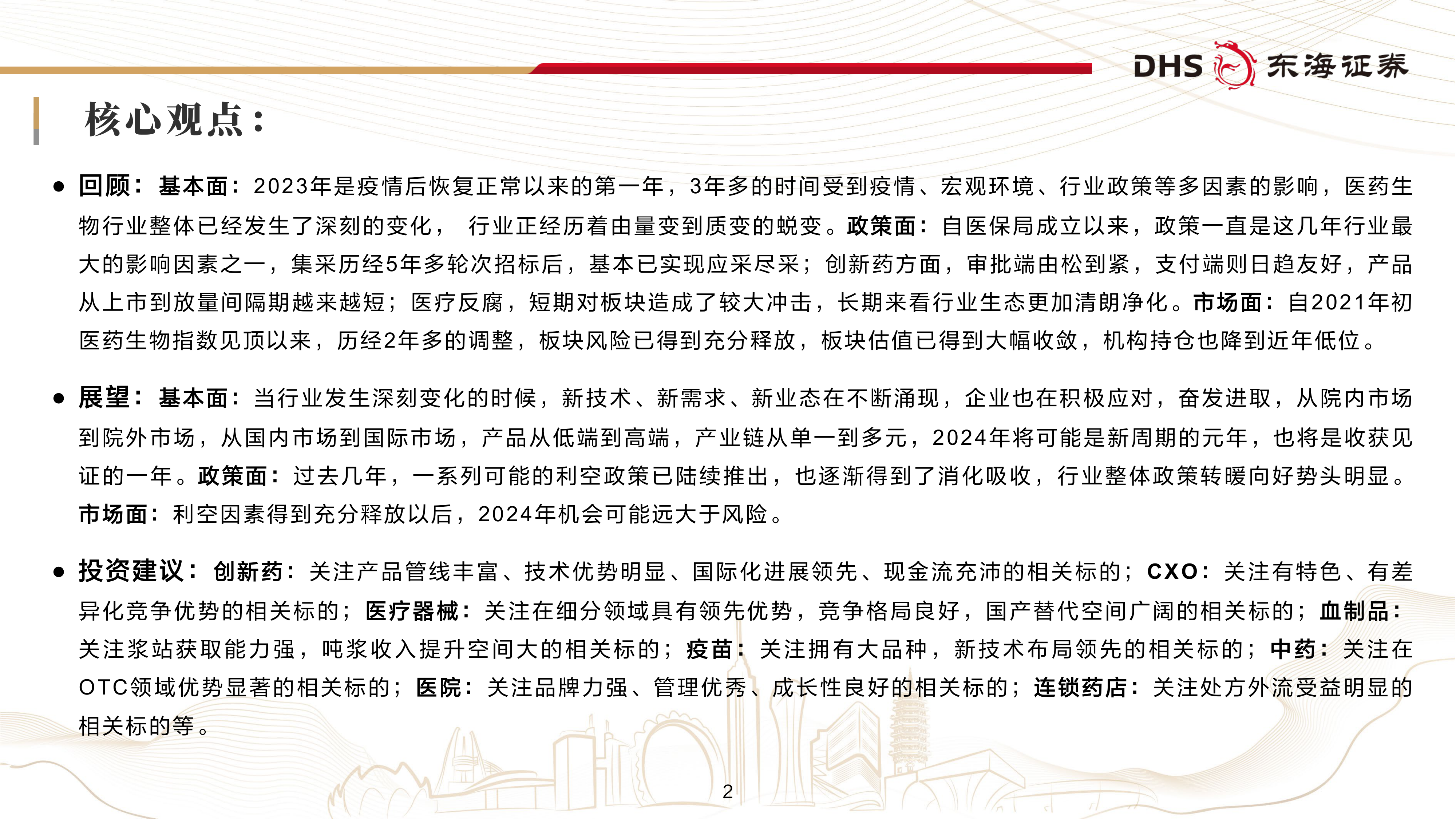 2024年被视为行业收获与见证的一年,利空因素充分消化后,机会将远大于风险。投资建议聚焦创新药、CXO、医疗器械、血制品、疫苗、中药、医院和连锁药店等细分领域,强调关注产品管线丰富、技术优势明显、国际化进展领先、现金流充沛、细分领域领先、竞争格局良好、国产替代空间广阔、浆站获取能力强、大品种布局、OTC优势显著以及品牌力强、管理优秀、成长性良好等特点的标的。行业转型升级在政策支持和创新驱动下,正迈向高质量发展的新阶段。