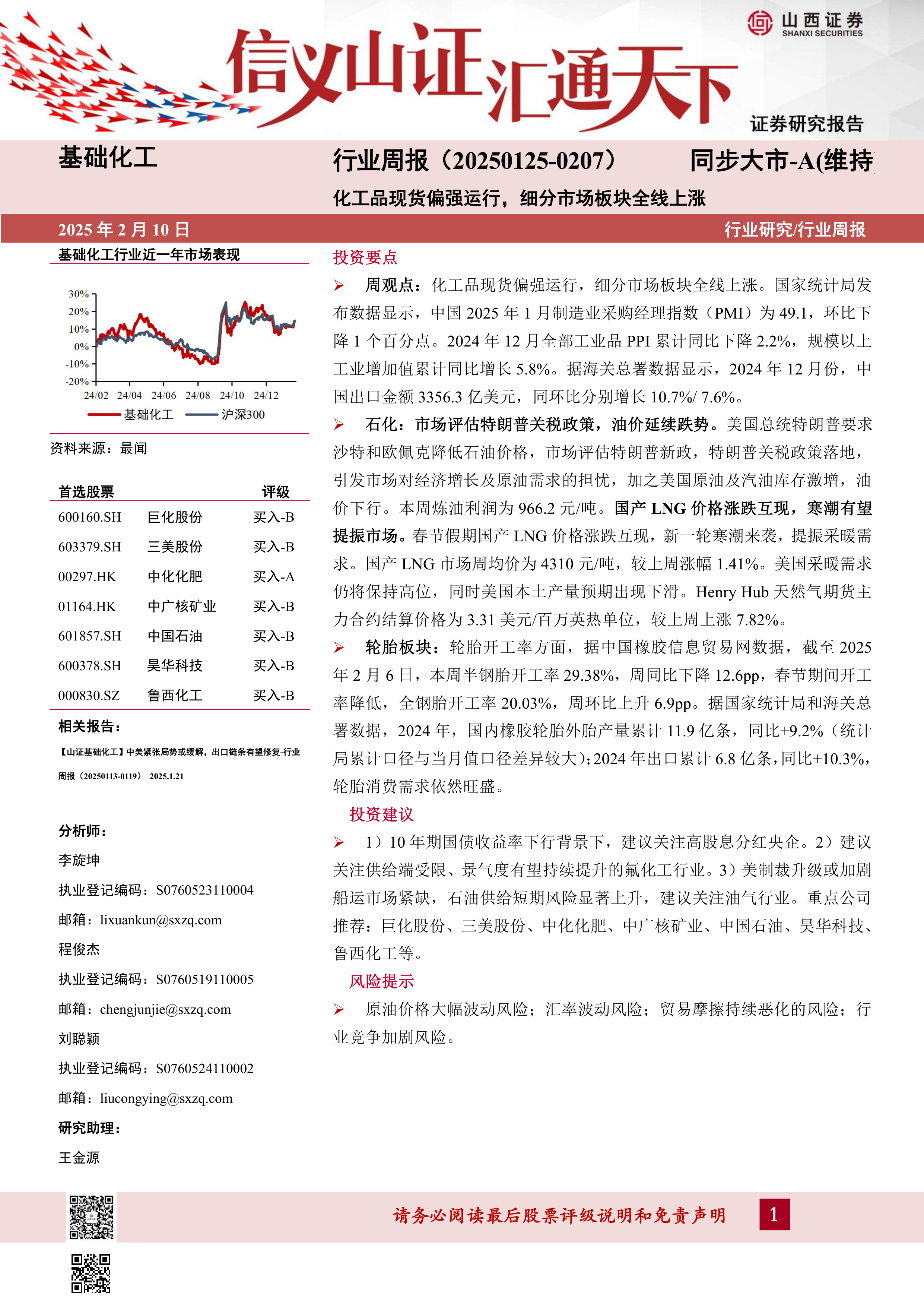 本周基础化工行业在宏观经济面临挑战的背景下,整体现货市场表现偏强,细分板块普遍上涨。尽管制造业PMI有所回落,但出口和工业增加值数据展现出经济的韧性。石化板块受地缘政治和库存因素影响,油价承压,但天然气需求因寒潮而提振。轮胎行业表现尤为突出,2024年产销量均实现双位数增长,需求旺盛。投资策略上,报告建议关注高股息央企、氟化工及油气行业,并强调需密切关注原油价格、汇率、贸易摩擦及行业竞争等关键风险因素。