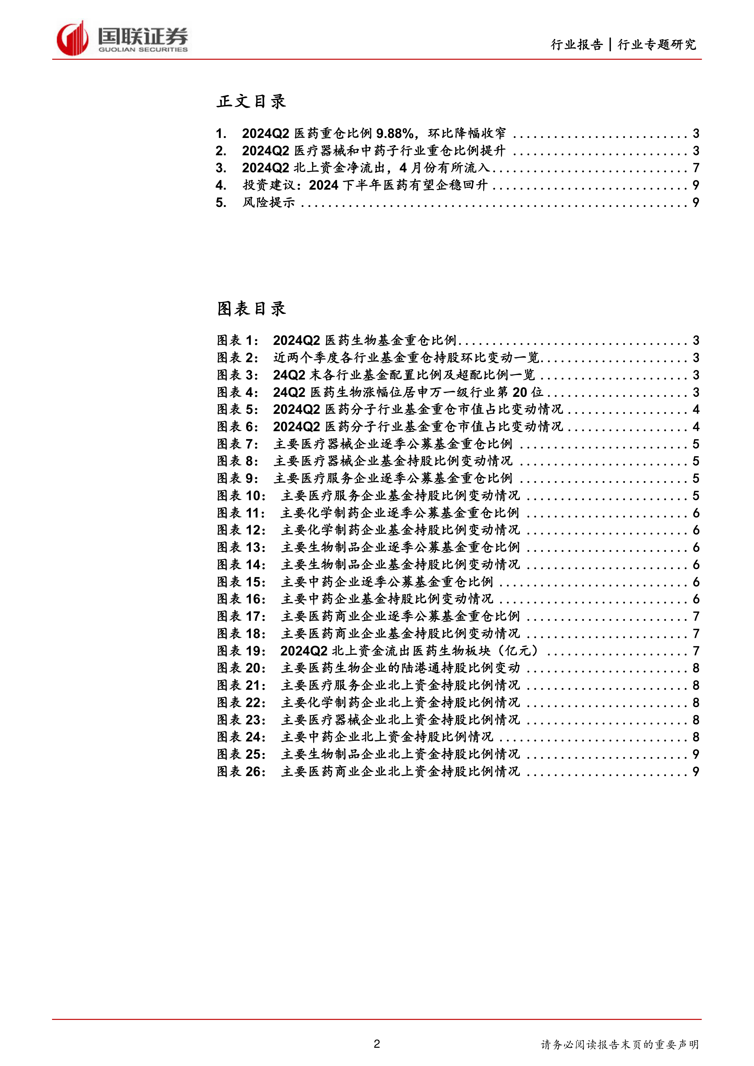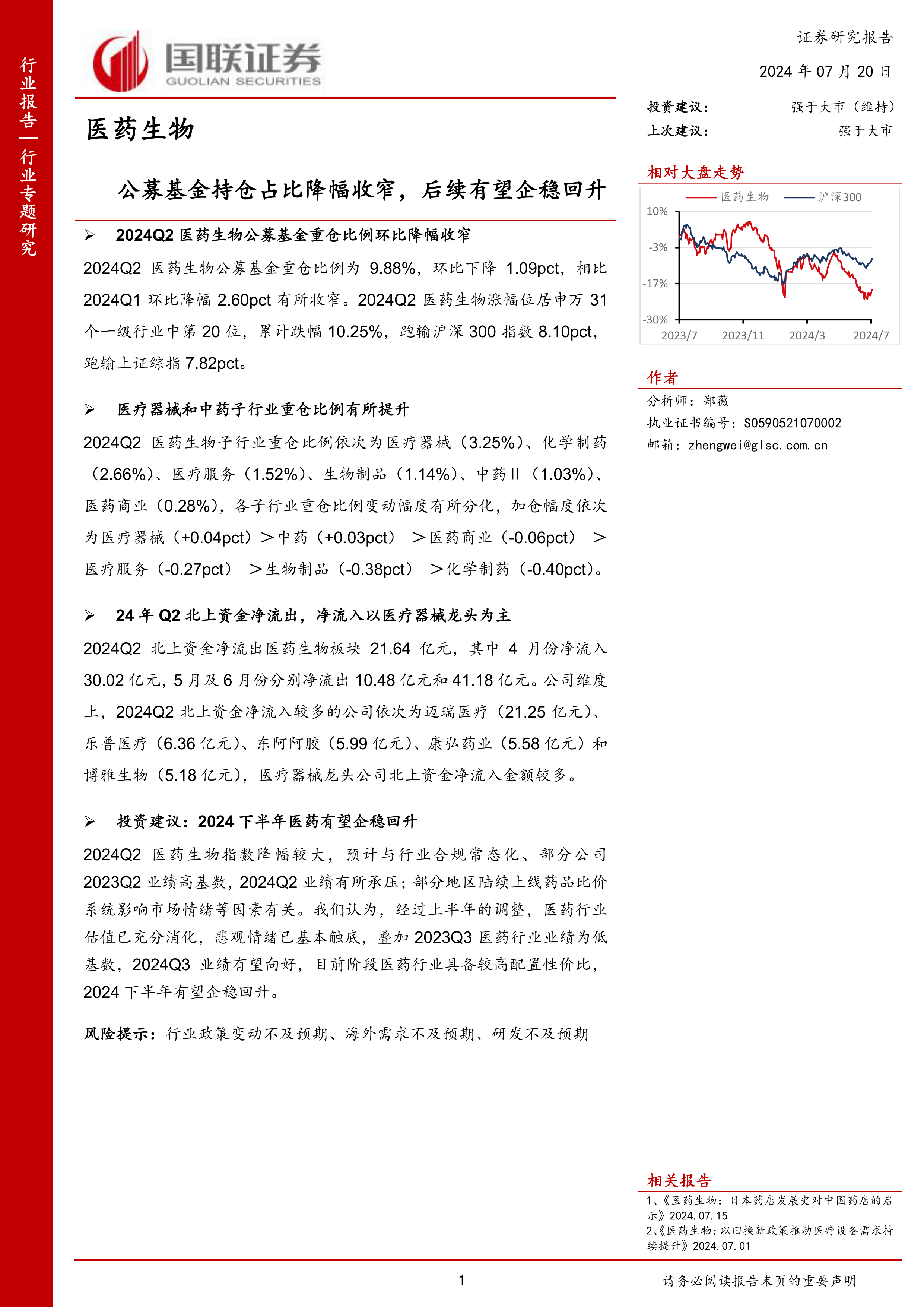 2024年第二季度,医药生物板块公募基金重仓比例降幅收窄至9.88%,显示市场情绪趋于稳定。尽管板块整体表现弱于大盘,但医疗器械和中药子行业逆势获得公募基金加仓,北上资金也主要青睐医疗器械龙头。报告分析认为,上半年行业估值已充分消化,悲观情绪触底,且2023年第三季度业绩低基数有望支撑2024年第三季度业绩向好。因此,当前医药行业具备较高配置性价比,预计2024年下半年有望企稳回升,但需关注行业政策、海外需求及研发进展等潜在风险。