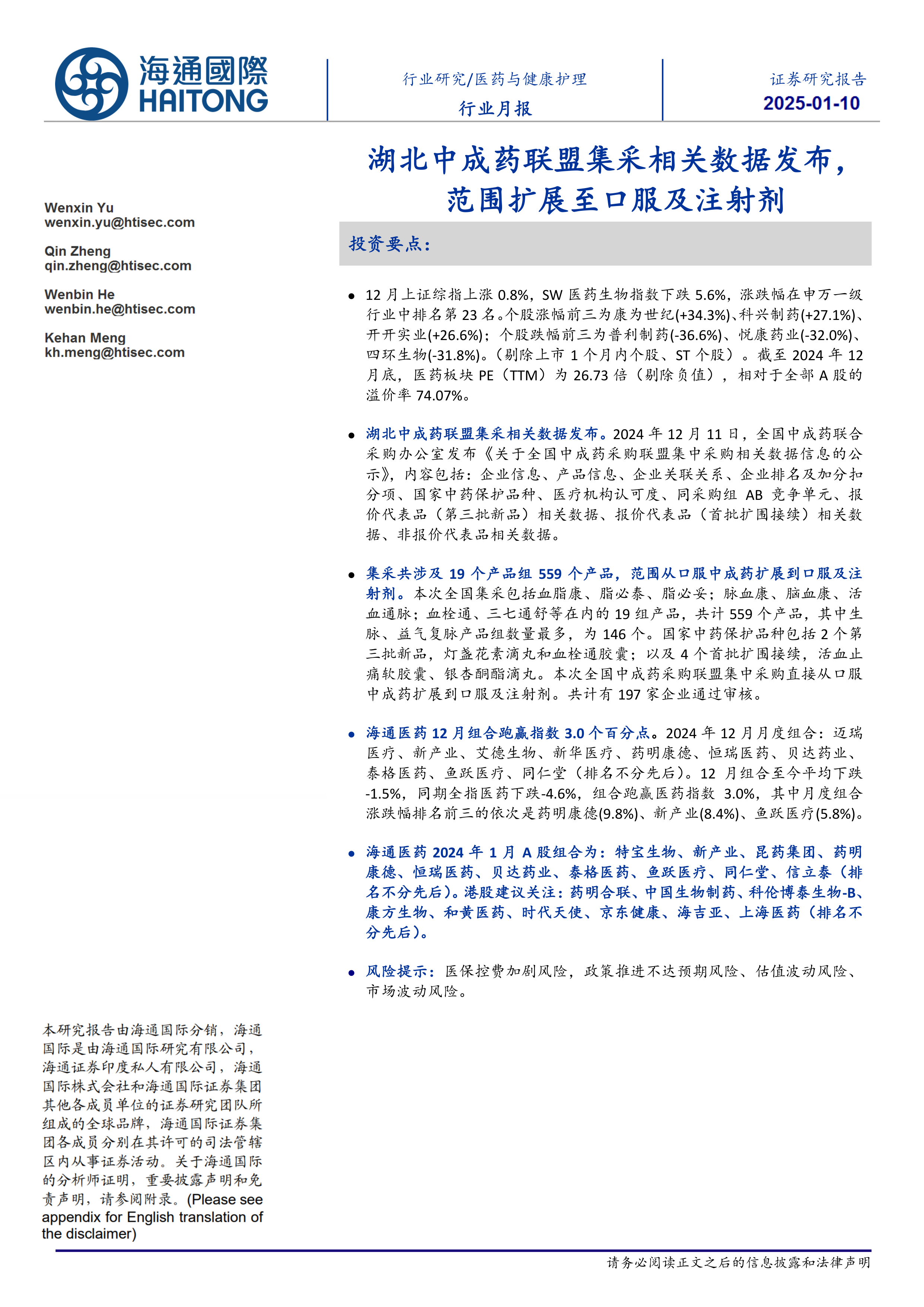 本报告分析了2024年12月医药行业的市场表现,医药生物指数跑输大盘,但海通医药的投资组合表现优于市场平均水平。报告还强调了医保控费、政策变动、估值波动和市场波动等风险因素,为投资者提供了参考信息。