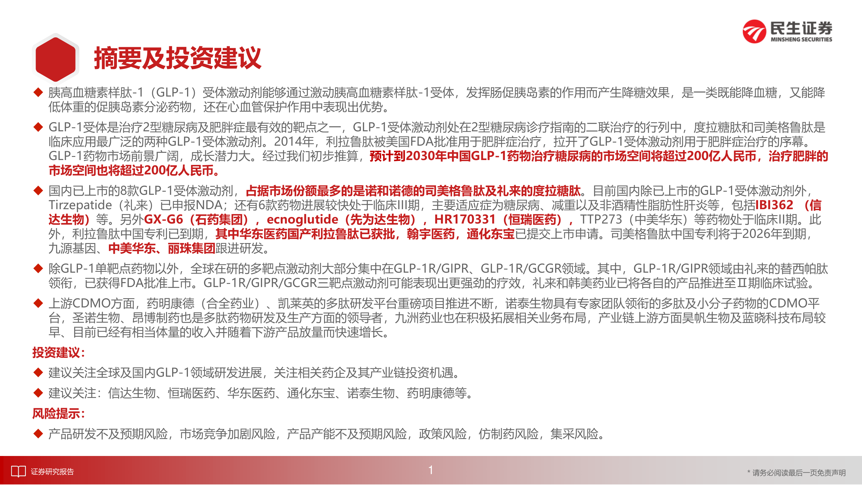 本报告核心观点指出,胰高血糖素样肽-1(GLP-1)受体激动剂作为治疗2型糖尿病和肥胖症的有效靶点,正迎来蓬勃发展。其市场前景广阔,预计到2030年,中国GLP-1药物在糖尿病和肥胖症治疗领域的市场空间将分别超过200亿人民币。随着多靶点激动剂的兴起和国内仿制药及创新药研发的加速,GLP-1药物的竞争格局日益激烈,同时带动了上游多肽产业链的快速成长。