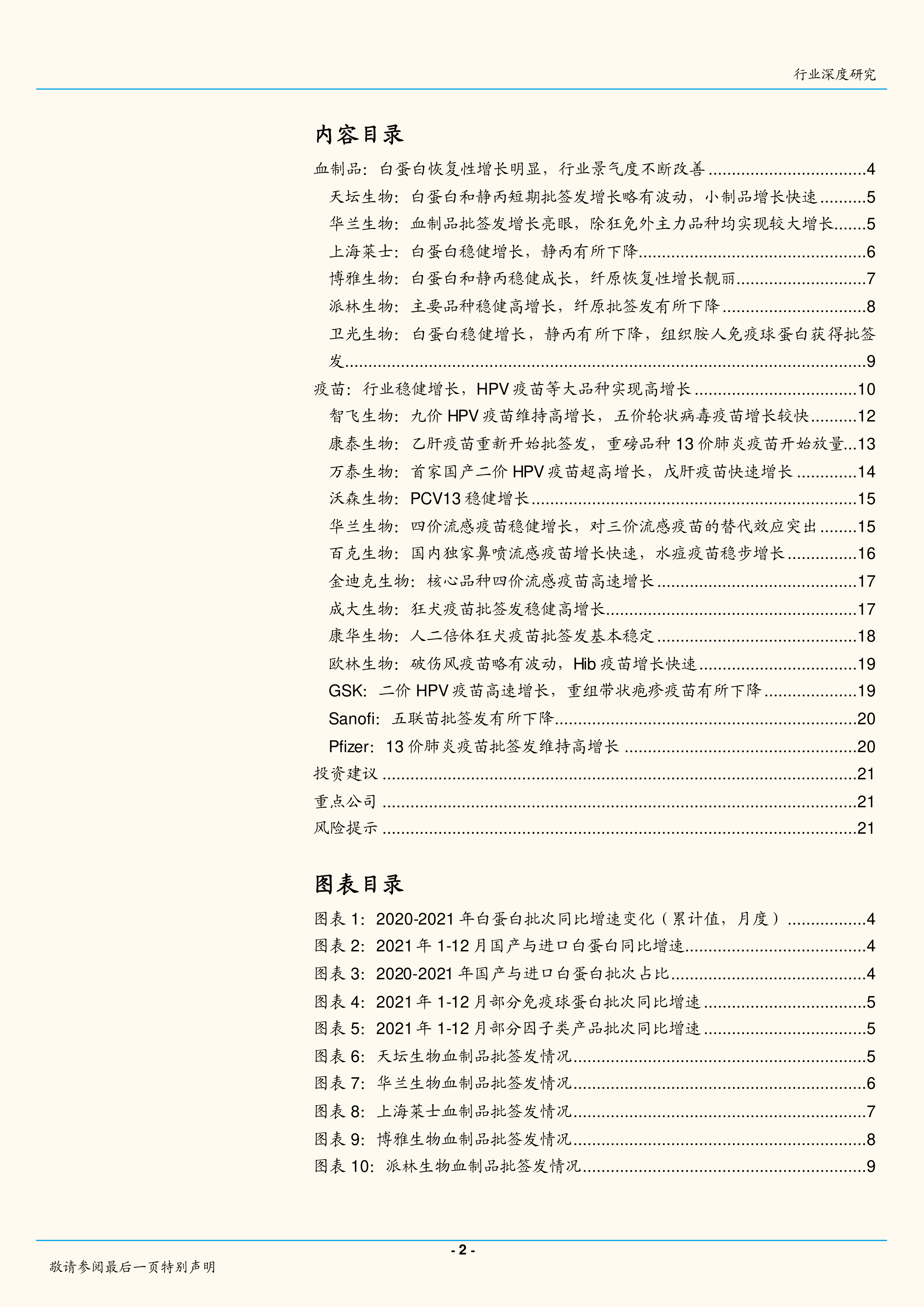 2021年中国生物制品行业整体呈现稳健增长态势,血制品和疫苗市场均在下半年实现显著复苏。血制品方面,人血白蛋白批签发量恢复性增长明显,进口产品占比提升,因子类产品增速亮眼。疫苗方面,总批签发量大幅增长,HPV疫苗和13价肺炎结合疫苗等大品种表现突出,国产疫苗市场份额逐步扩大,新产品如康泰生物的13价肺炎疫苗也开始放量。展望未来,血制品行业在后疫情时代基础扎实,疫苗行业常规品种有望加速放量,但需警惕数据统计误差、需求恢复不及预期及疫情变异等潜在风险。