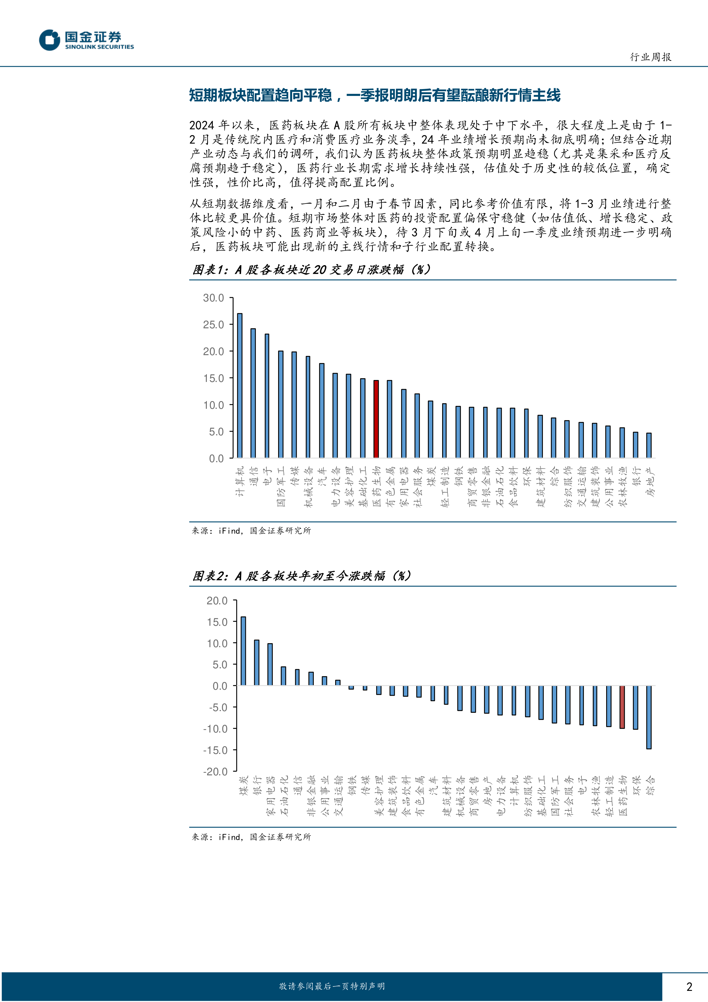 从短期数据维度看,一月和二月由于春节因素,同比参考价值有限,将1-3月业绩进行整体比较更具价值。短期市场整体对医药的投资配置偏保守稳健(如估值低、增长稳定、政策风险小的中药、医药商业等板块),待3月下旬或4月上旬一季度业绩预期进一步明确后,医药板块可能出现新的主线行情和子行业配置转换。