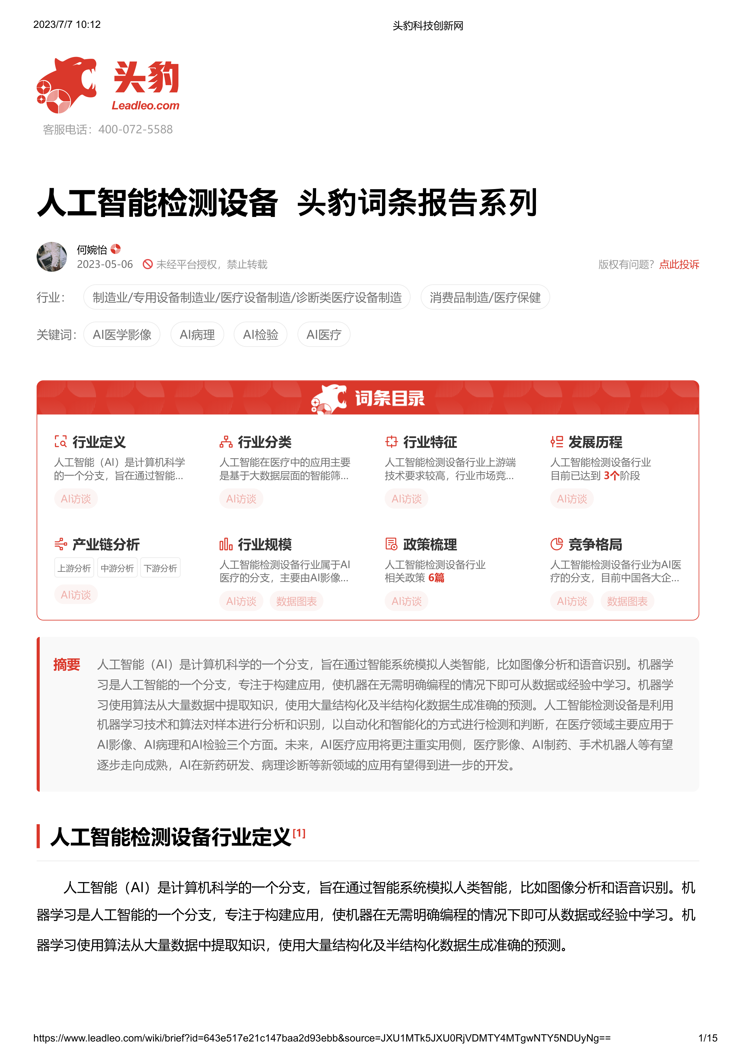 人工智能检测设备 头豹词条报告系列