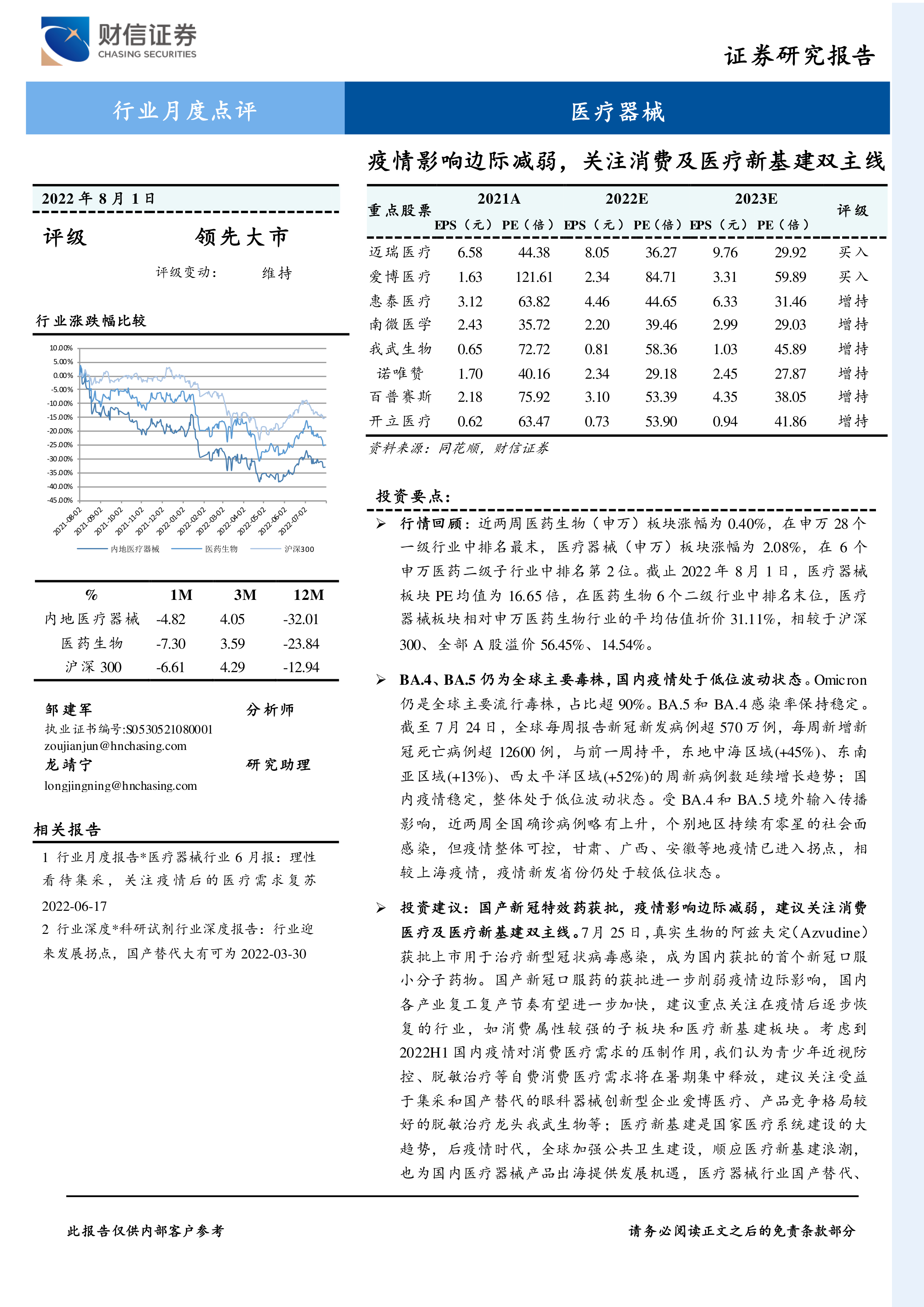 投资建议:国产新冠特效药获批,疫情影响边际减弱,建议关注消费医疗及医疗新基建双主线。 7 月 25 日,真实生物的阿兹夫定(Azvudine)获批上市用于治疗新型冠状病毒感染,成为国内获批的首个新冠口服小分子药物。国产新冠口服药的获批进一步削弱疫情边际影响,国内各产业复工复产节奏有望进一步加快,建议重点关注在疫情后逐步恢复的行业,如消费属性较强的子板块和医疗新基建板块。考虑到2022H1 国内疫情对消费医疗需求的压制作用,我们认为青少年近视防控、脱敏治疗等自费消费医疗需求将在暑期集中释放,建议关注受益于集采和国产替代的眼科器械创新型企业爱博医疗、产品竞争格局较好的脱敏治疗龙头我武生物等;医疗新基建是国家医疗系统建设的大趋势,后疫情时代,全球加强公共卫生建设,顺应医疗新基建浪潮,也为国内医疗器械产品出海提供发展机遇,医疗器械行业国产替代、国际化进程持续加速。在此背景下,建议关注自主创新、具备出海能力的医疗器械研发平台化厂家,如南微医学、迈瑞医疗、开立医疗、惠泰医疗等;同时,我们也看好受益于下游药物研发高景气、国产替代的生命科学上游厂家,如诺唯赞、百普赛斯、纳微科技等。
