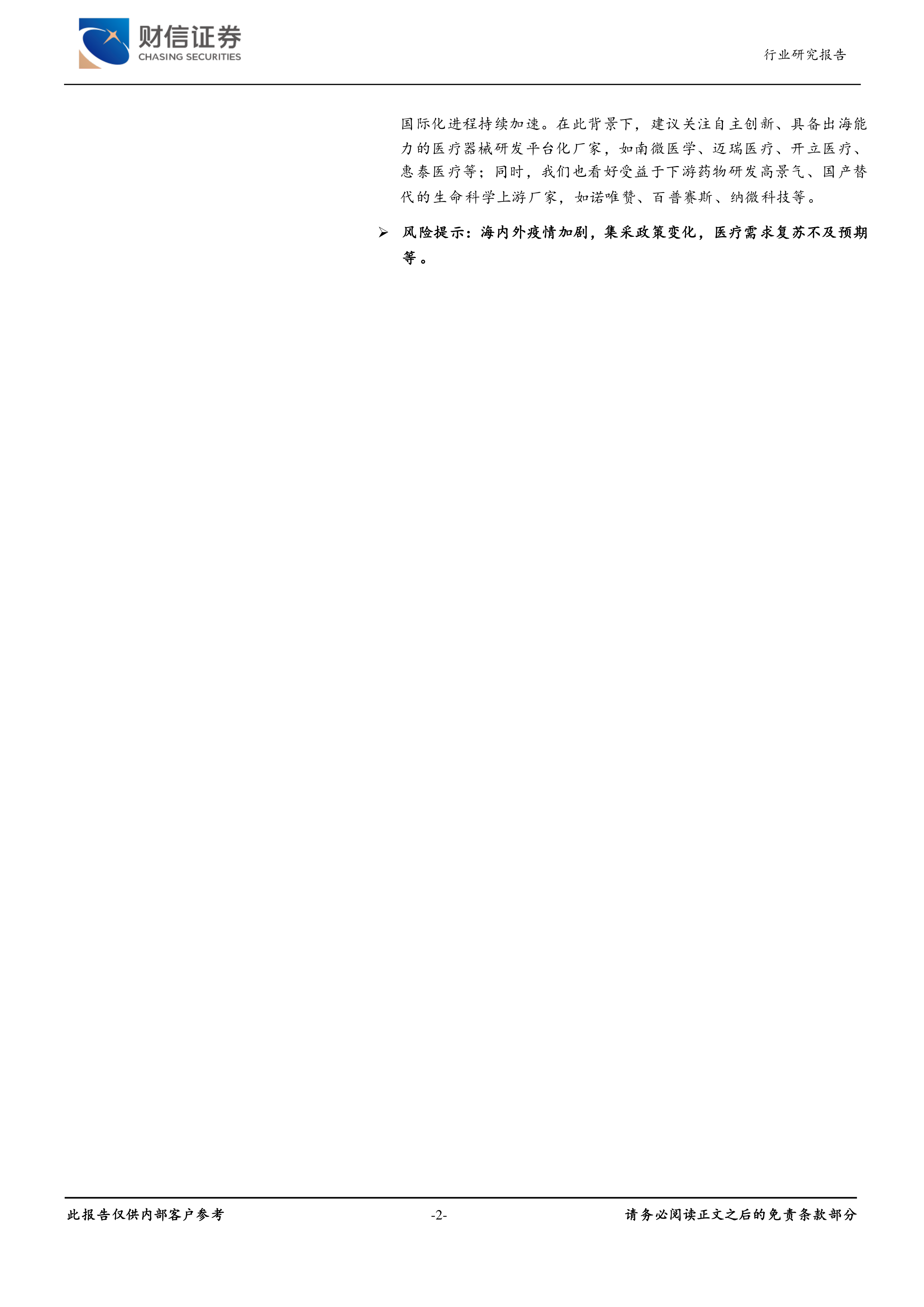 风险提示:海内外疫情加剧,集采政策变化,医疗需求复苏不及预期等。
