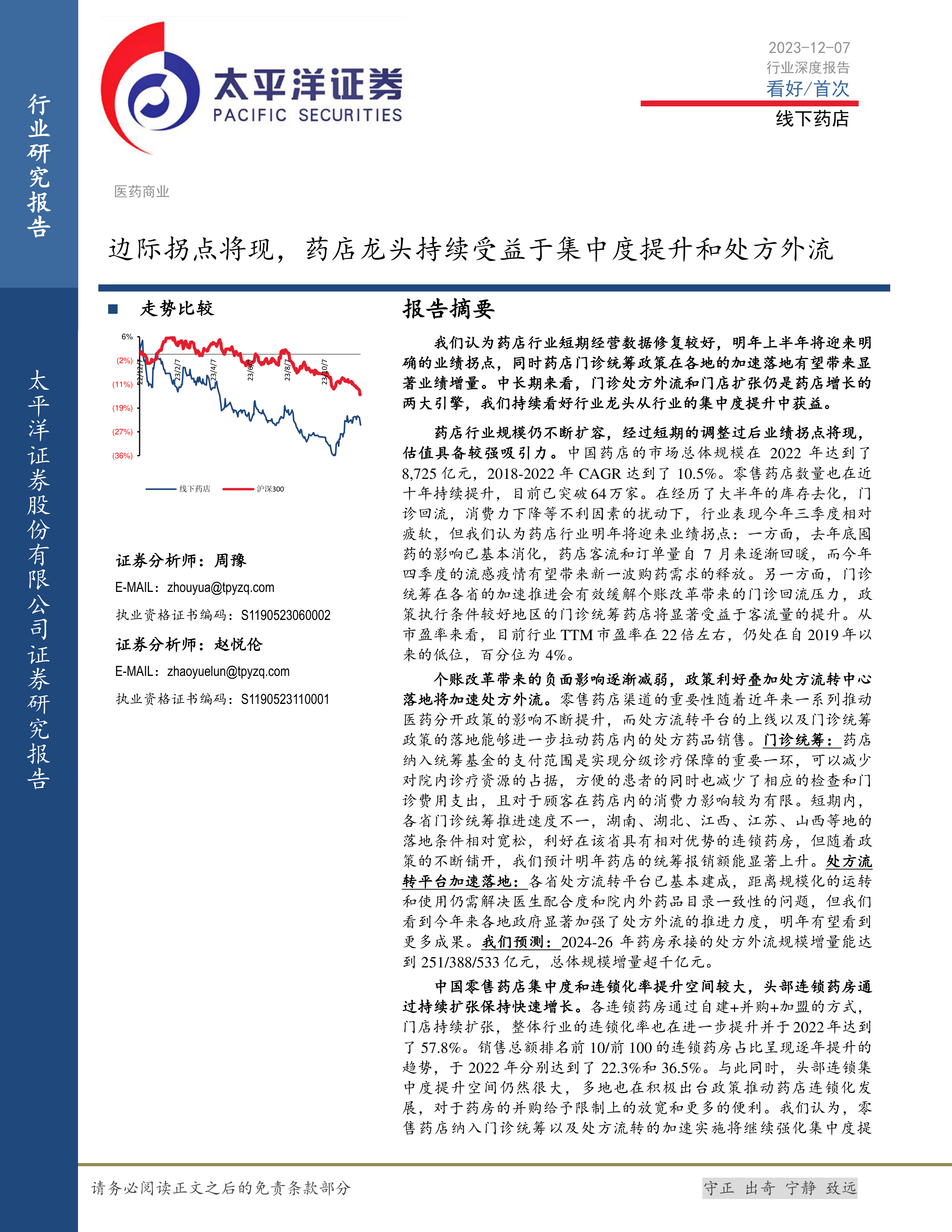风险提示:门诊统筹政策落地速度和执行力度不及预期,处方流转平台落地和使用情况不及预期,连锁企业门店扩张速度和新店经营情况不及预期,行业内竞争加剧,医保政策变化等风险。