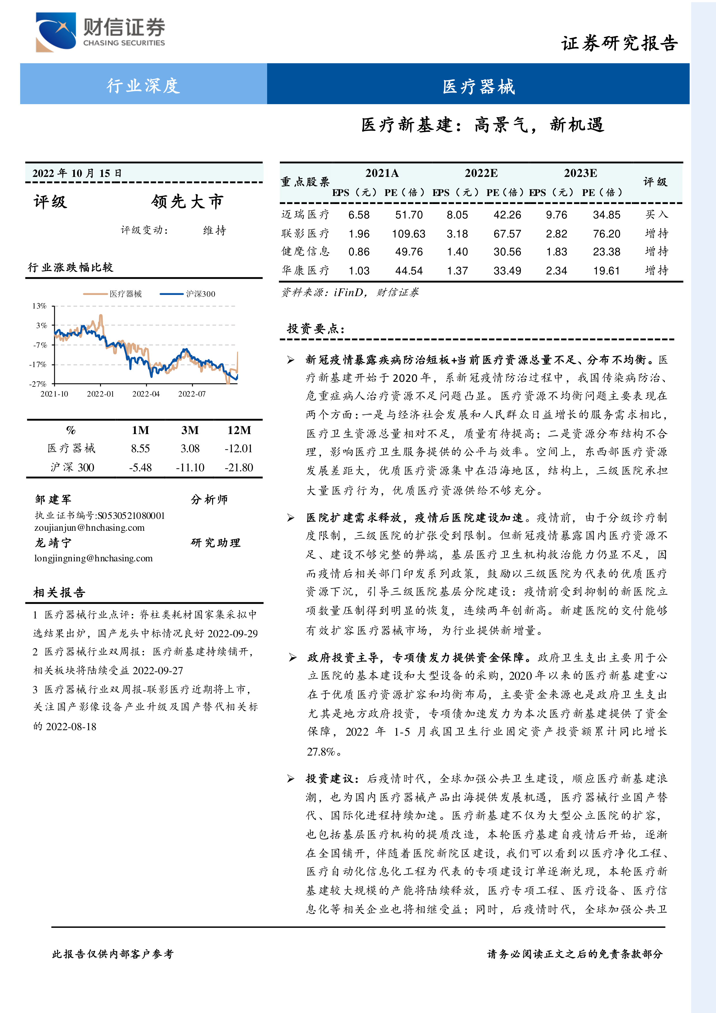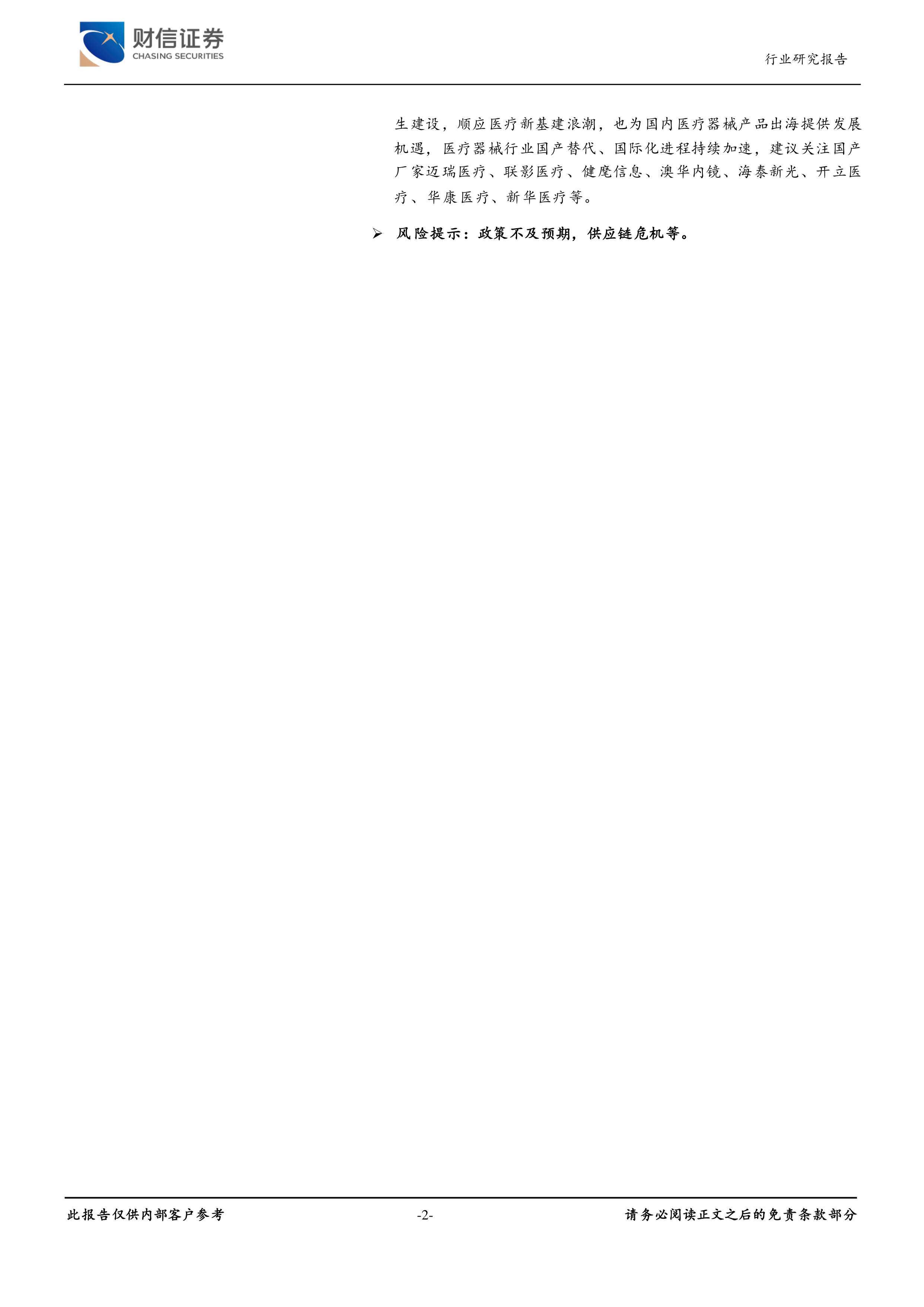 投资建议:后疫情时代,全球加强公共卫生建设,顺应医疗新基建浪潮,也为国内医疗器械产品出海提供发展机遇,医疗器械行业国产替代、国际化进程持续加速。医疗新基建不仅为大型公立医院的扩容,也包括基层医疗机构的提质改造,本轮医疗基建自疫情后开始,逐渐在全国铺开, 伴随着医院新院区建设, 我们可以看到以医疗净化工程、医疗自动化信息化工程为代表的专项建设订单逐渐兑现,本轮医疗新基建较大规模的产能将陆续释放,医疗专项工程、医疗设备、医疗信息化等相关企业也将相继受益;同时,后疫情时代,全球加强公共卫生建设,顺应医疗新基建浪潮,也为国内医疗器械产品出海提供发展机遇,医疗器械行业国产替代、国际化进程持续加速,建议关注国产厂家迈瑞医疗、联影医疗、健麾信息、澳华内镜、海泰新光、开立医疗、华康医疗、新华医疗等。