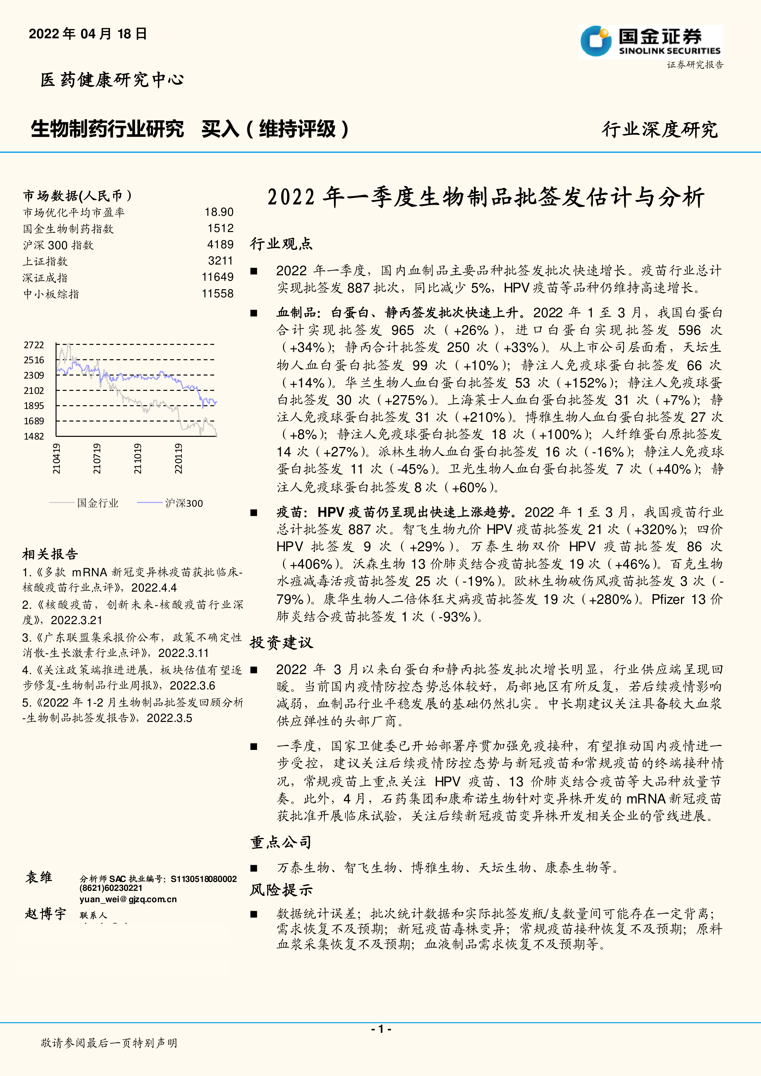 生物制药行业研究:2022年一季度生物制品批签发估计与分析