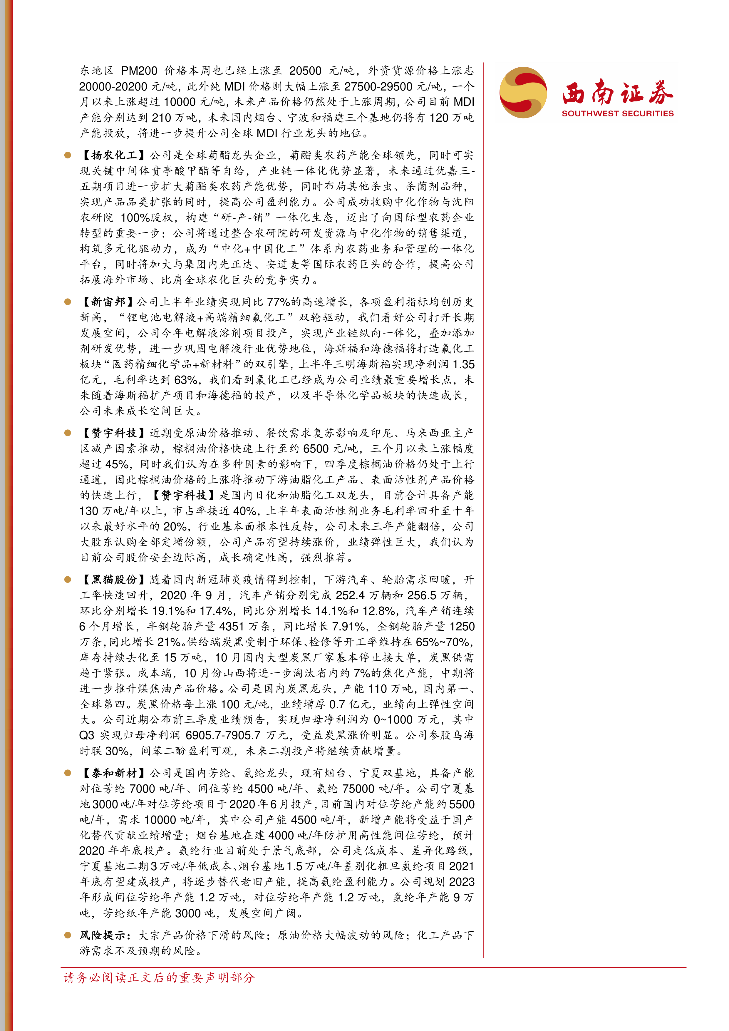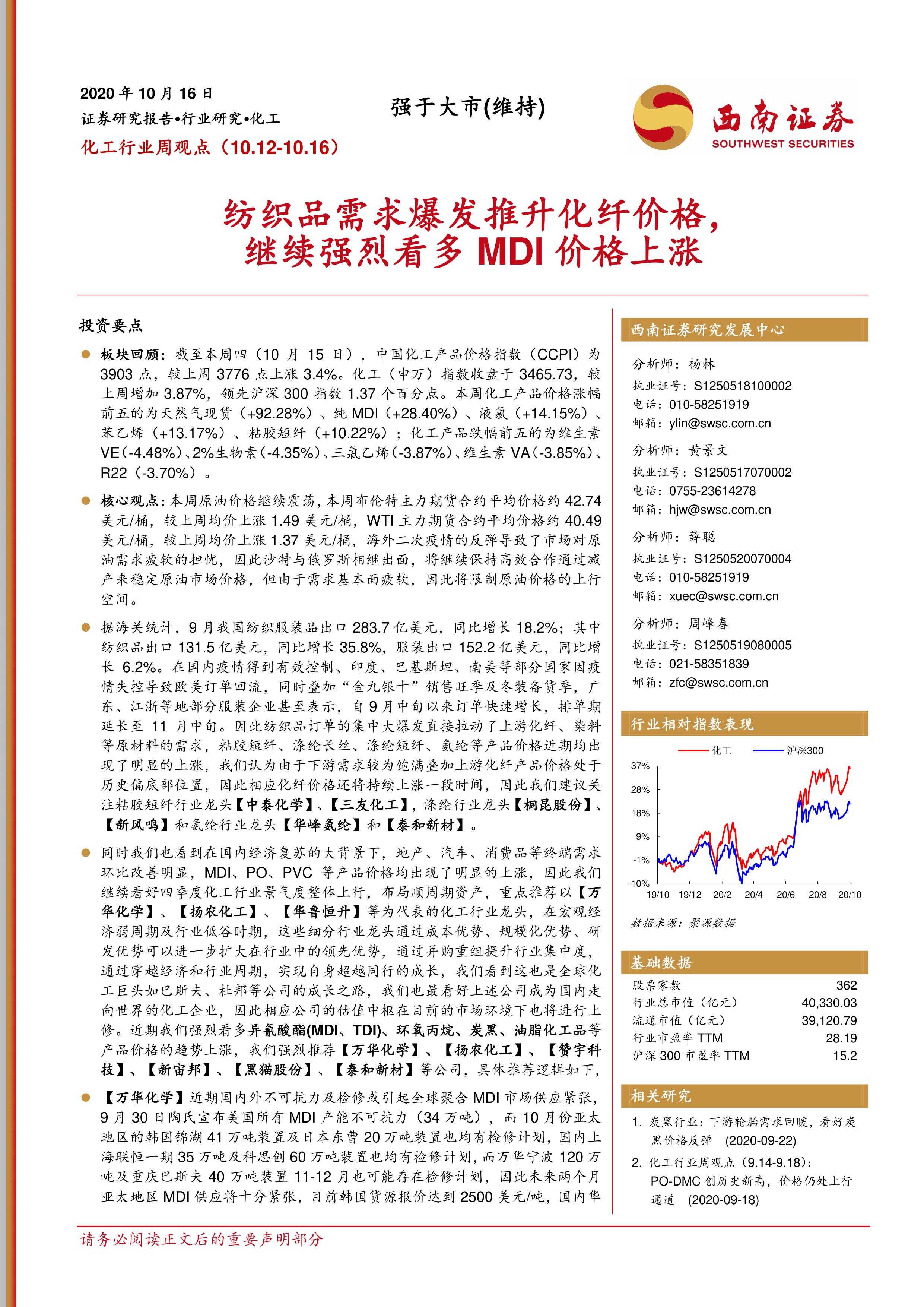 本报告核心观点指出,在国内外多重利好因素叠加下,化工行业景气度整体上行,维持“强于大市”评级。主要驱动力包括:国内疫情有效控制后经济强劲复苏,地产、汽车、消费品等终端需求环比显著改善;海外疫情导致部分国家订单回流中国,叠加“金九银十”销售旺季及冬装备货季,纺织服装品出口爆发式增长,直接拉动上游化纤、染料等原材料需求;以及部分化工产品因不可抗力、检修及供需趋紧导致价格大幅上涨。