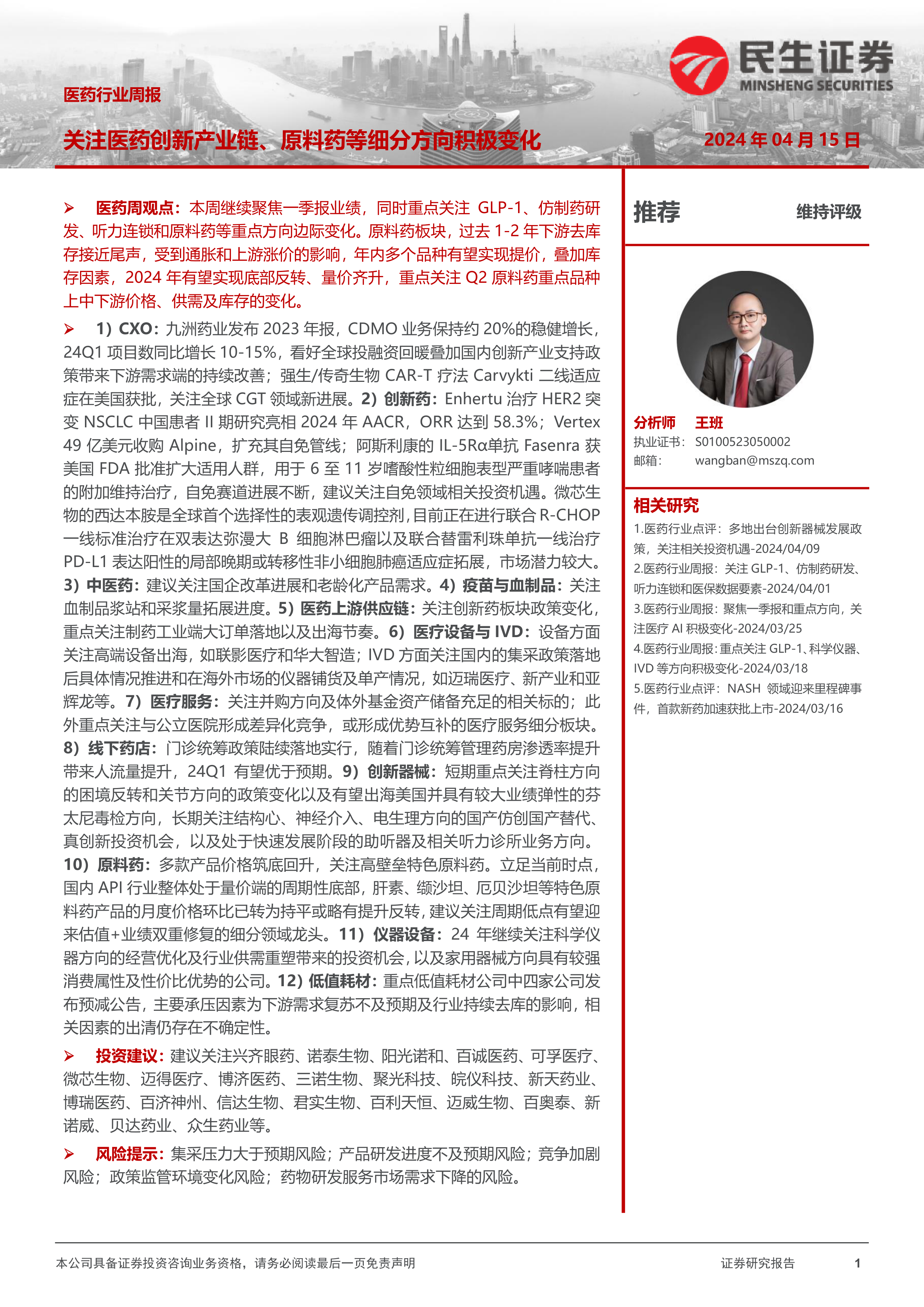 1)CXO:九洲药业发布2023年报,CDMO业务保持约20%的稳健增长,24Q1项目数同比增长10-15%,看好全球投融资回暖叠加国内创新产业支持政策带来下游需求端的持续改善;强生/传奇生物CAR-T疗法Carvykti二线适应症在美国获批,关注全球CGT领域新进展。2)创新药:Enhertu治疗HER2突变NSCLC中国患者II期研究亮相2024年AACR,ORR达到58.3%;Vertex49亿美元收购Alpine,扩充其自免管线;阿斯利康的IL-5Rα单抗Fasenra获美国FDA批准扩大适用人群,用于6至11岁嗜酸性粒细胞表型严重哮喘患者的附加维持治疗,自免赛道进展不断,建议关注自免领域相关投资机遇。微芯生物的西达本胺是全球首个选择性的表观遗传调控剂,目前正在进行联合R-CHOP一线标准治疗在双表达弥漫大B细胞淋巴瘤以及联合替雷利珠单抗一线治疗PD-L1表达阳性的局部晚期或转移性非小细胞肺癌适应症拓展,市场潜力较大。