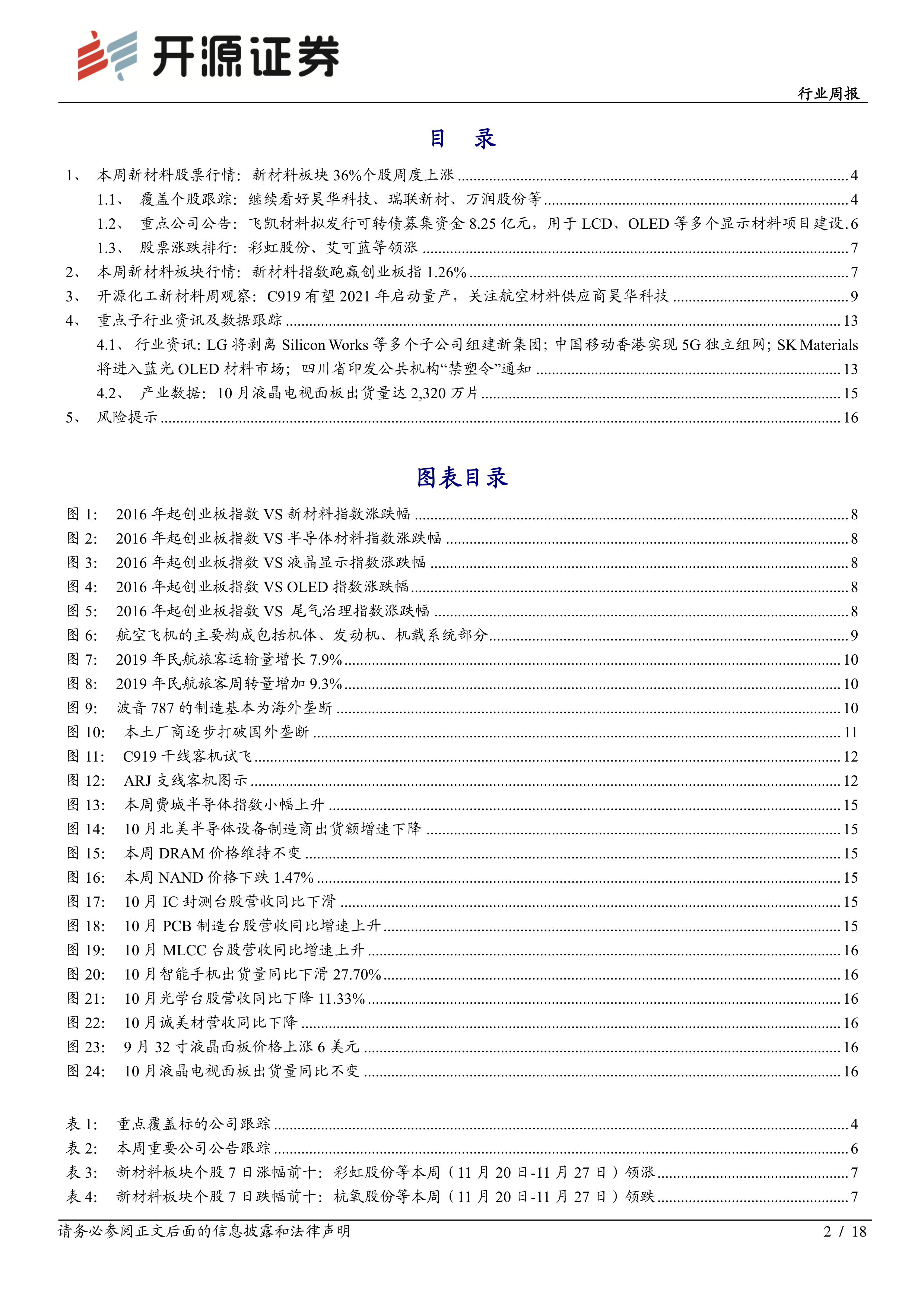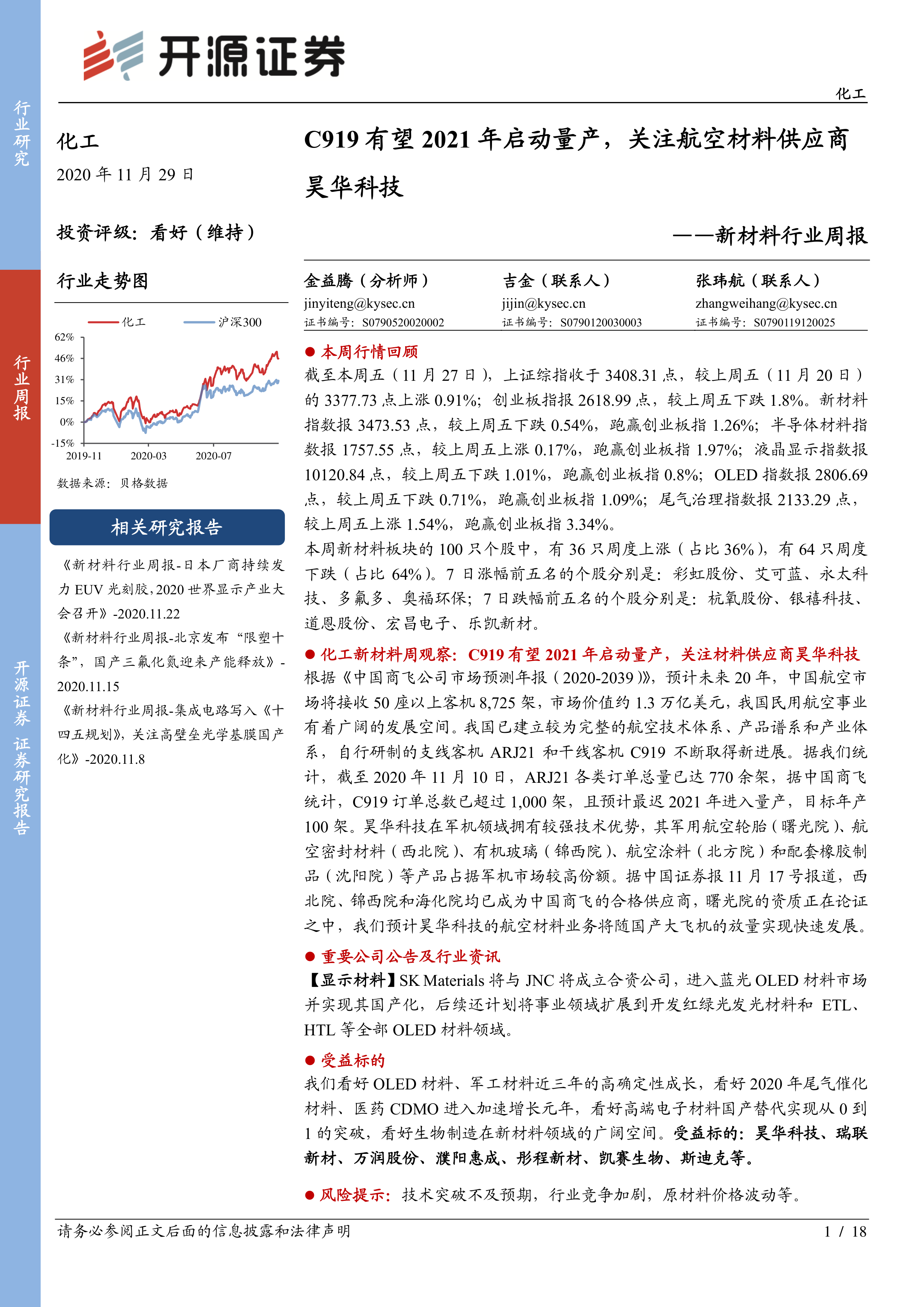 本报告核心观点指出,尽管市场存在波动,新材料行业整体表现出较强韧性,多个细分领域跑赢大盘。特别是随着国产大飞机C919有望于2021年启动量产,航空材料市场将迎来广阔增长空间,昊华科技等核心供应商有望实现快速发展。同时,OLED材料、军工材料、尾气催化材料、高端电子材料国产替代以及生物制造等新兴领域,均展现出高确定性成长和从0到1的突破潜力。