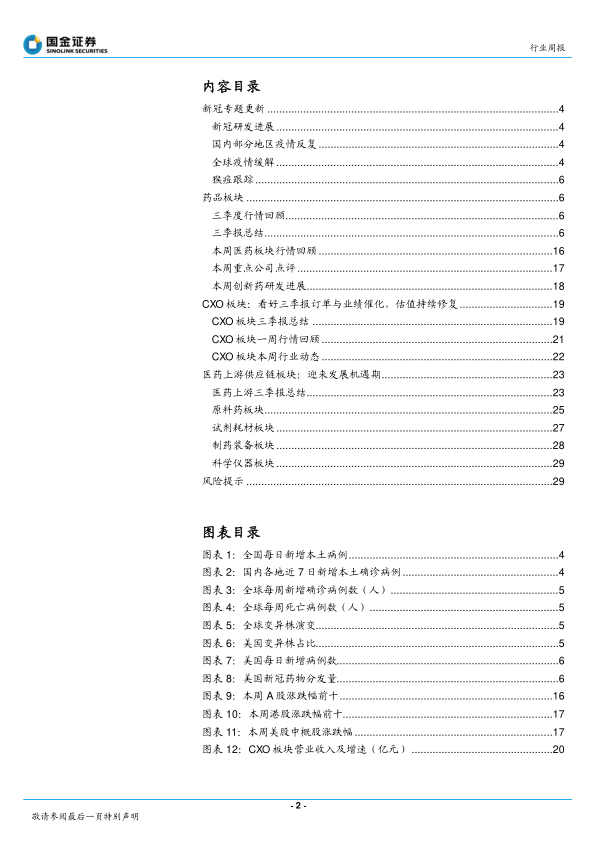 CXO 板块: 国内三季报来看 CXO 板块(特别是龙头企业)订单和业绩持续超预期,多数公司订单高增长、排产饱满,业绩高增长、未来成长确定性强。 海外 CXO 企业的三季报来看非新冠医药创新研发需求旺盛,特别是 biotech 需求稳定,好于之前市场预期。 目前板块估值及市场情绪处于历史底部, 看好 CXO 板块估值持续修复。 继续重点关注具备国际竞争力和国内市场优势的综合性龙头企业和细分领域龙头。