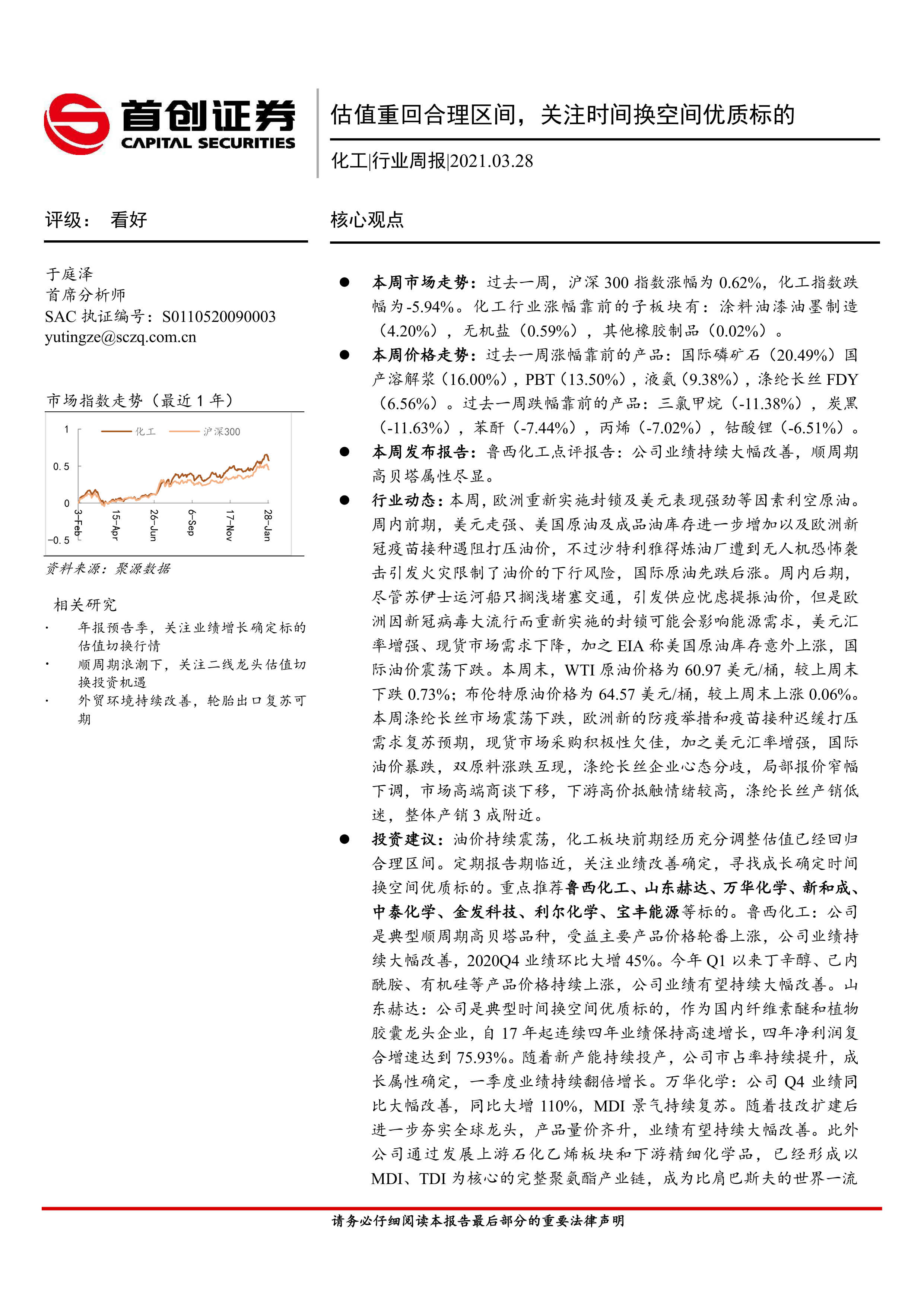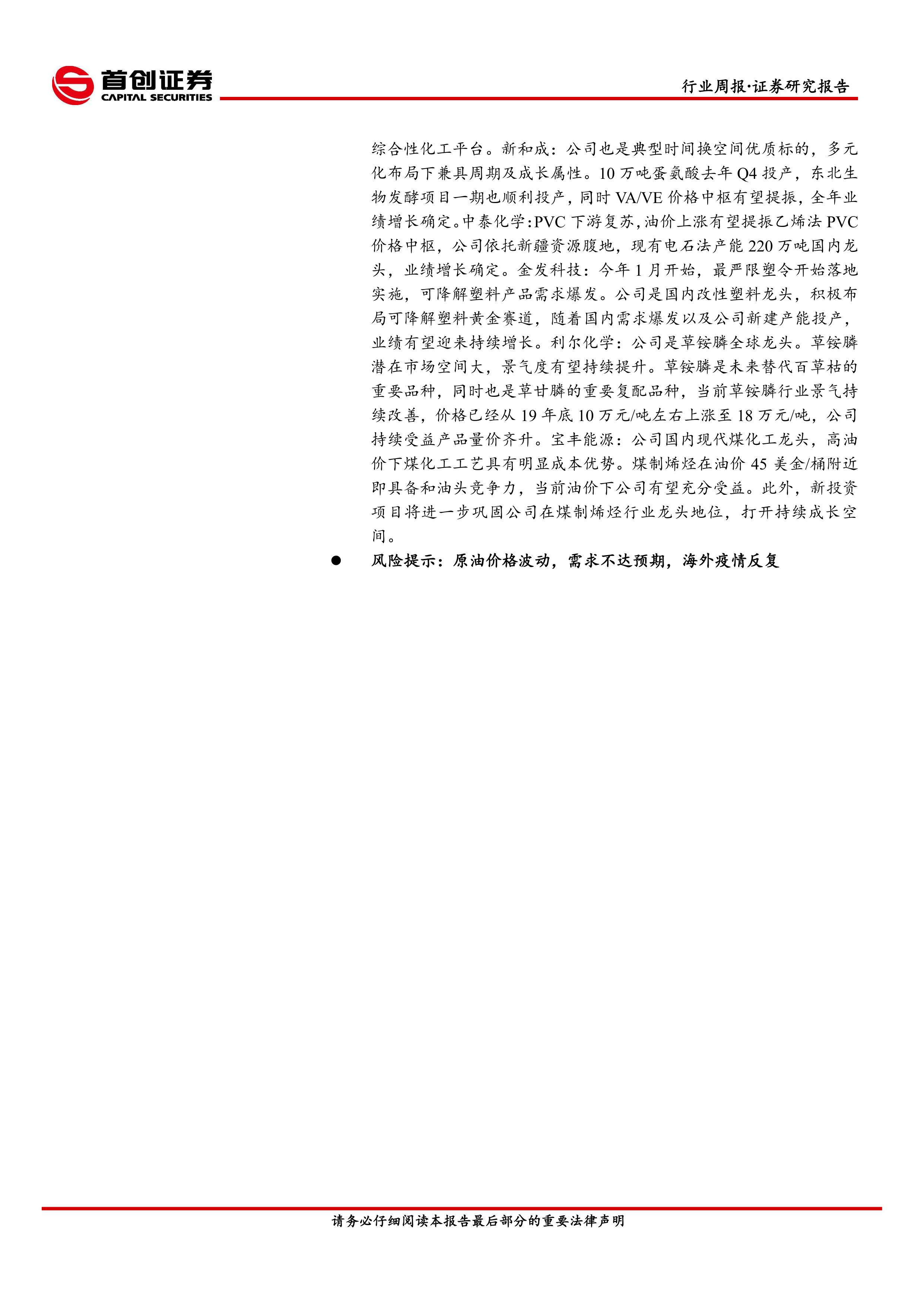 投资建议:油价持续震荡,化工板块前期经历充分调整估值已经回归合理区间。定期报告期临近,关注业绩改善确定,寻找成长确定时间换空间优质标的。重点推荐鲁西化工、山东赫达、万华化学、新和成、中泰化学、金发科技、利尔化学、宝丰能源等标的。鲁西化工:公司是典型顺周期高贝塔品种,受益主要产品价格轮番上涨,公司业绩持续大幅改善, 2020Q4 业绩环比大增 45%。今年 Q1 以来丁辛醇、己内酰胺、有机硅等产品价格持续上涨,公司业绩有望持续大幅改善。山东赫达:公司是典型时间换空间优质标的,作为国内纤维素醚和植物胶囊龙头企业,自 17 年起连续四年业绩保持高速增长,四年净利润复合增速达到 75.93%。随着新产能持续投产,公司市占率持续提升,成长属性确定,一季度业绩持续翻倍增长。万华化学:公司 Q4 业绩同比大幅改善,同比大增 110%,MDI 景气持续复苏。随着技改扩建后进一步夯实全球龙头,产品量价齐升,业绩有望持续大幅改善。此外公司通过发展上游石化乙烯板块和下游精细化学品,已经形成以MDI、TDI 为核心的完整聚氨酯产业链,成为比肩巴斯夫的世界一流综合性化工平台。新和成:公司也是典型时间换空间优质标的,多元化布局下兼具周期及成长属性。10 万吨蛋氨酸去年 Q4 投产,东北生物发酵项目一期也顺利投产,同时 VA/VE 价格中枢有望提振,全年业绩增长确定。中泰化学: PVC 下游复苏,油价上涨有望提振乙烯法 PVC价格中枢,公司依托新疆资源腹地,现有电石法产能 220 万吨国内龙头,业绩增长确定。金发科技:今年 1 月开始,最严限塑令开始落地实施,可降解塑料产品需求爆发。公司是国内改性塑料龙头,积极布局可降解塑料黄金赛道,随着国内需求爆发以及公司新建产能投产,业绩有望迎来持续增长。利尔化学:公司是草铵膦全球龙头。草铵膦潜在市场空间大,景气度有望持续提升。草铵膦是未来替代百草枯的重要品种,同时也是草甘膦的重要复配品种,当前草铵膦行业景气持续改善,价格已经从 19 年底 10 万元/吨左右上涨至 18 万元/吨,公司持续受益产品量价齐升。宝丰能源:公司国内现代煤化工龙头,高油价下煤化工工艺具有明显成本优势。煤制烯烃在油价 45 美金/桶附近即具备和油头竞争力,当前油价下公司有望充分受益。此外,新投资项目将进一步巩固公司在煤制烯烃行业龙头地位,打开持续成长空间。