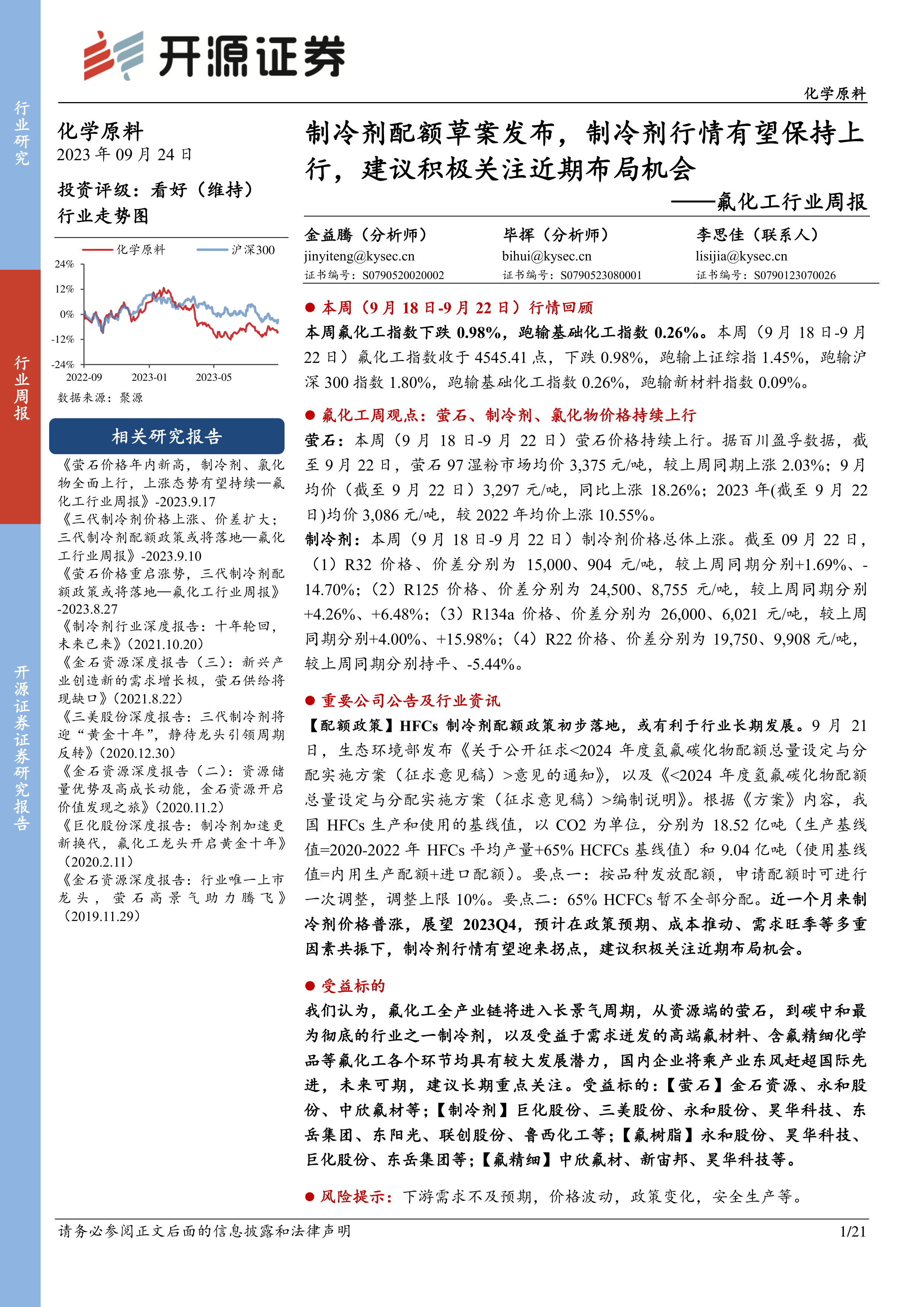 氟化工行业周报:制冷剂配额草案发布,制冷剂行情有望保持上行,建议积极关注近期布局机会