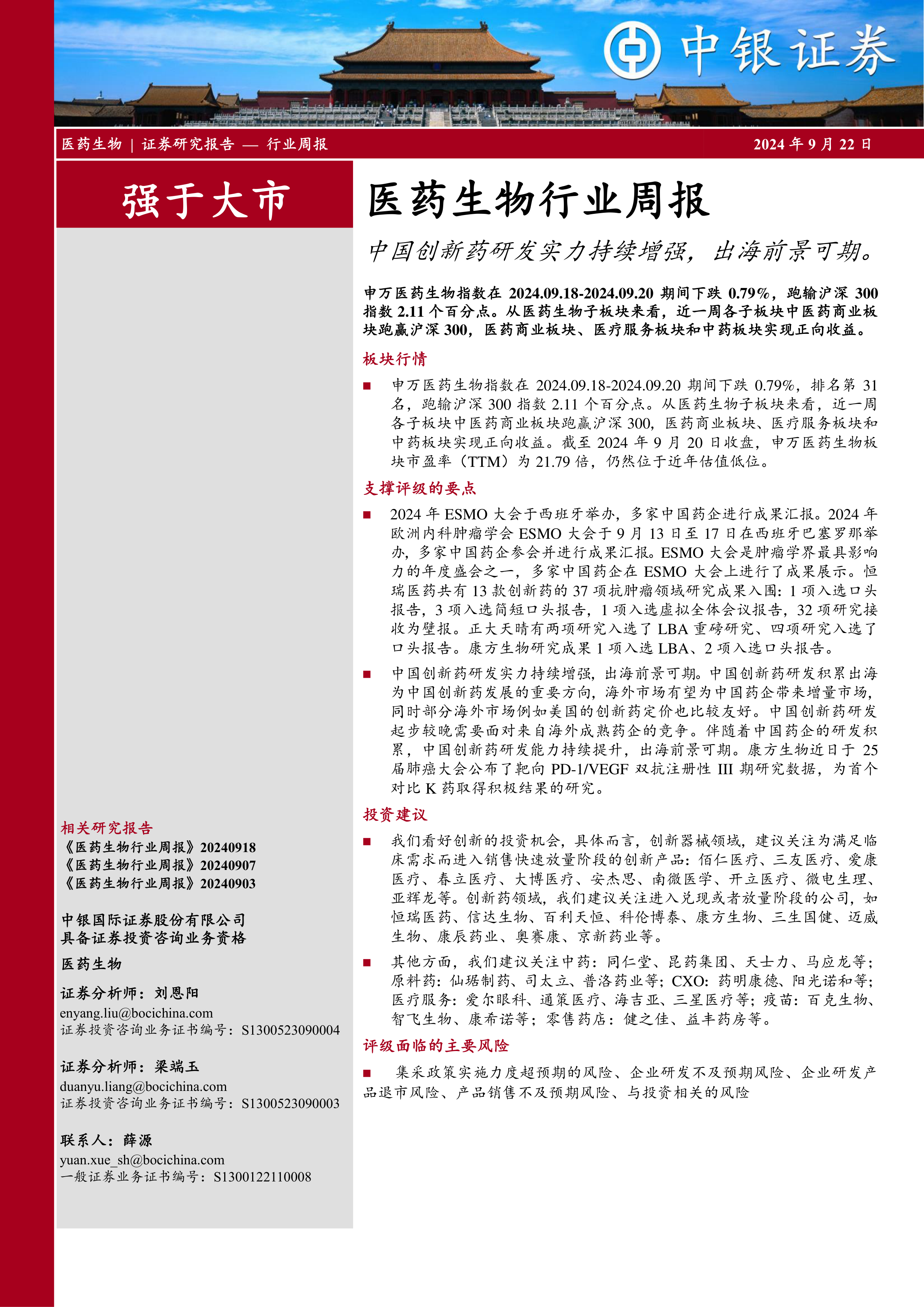 本周医药生物行业整体表现承压,申万医药生物指数跑输大盘,但估值已处于近年低位。子板块表现分化,医药商业、医疗服务和中药板块实现正向收益。中国创新药研发实力持续增强,在ESMO大会上多家药企展示了重要成果,特别是康方生物的依沃西单抗在肺癌III期临床中取得突破性进展,凸显了中国创新药出海的巨大潜力。报告建议关注创新器械、创新药、中药、原料药、CXO、医疗服务和疫苗等细分领域的投资机会,并提示了集采政策、研发不及预期、产品退市及销售不及预期等潜在风险。整体而言,尽管短期市场波动,但中国创新药的长期发展趋势和国际化前景依然值得期待。
