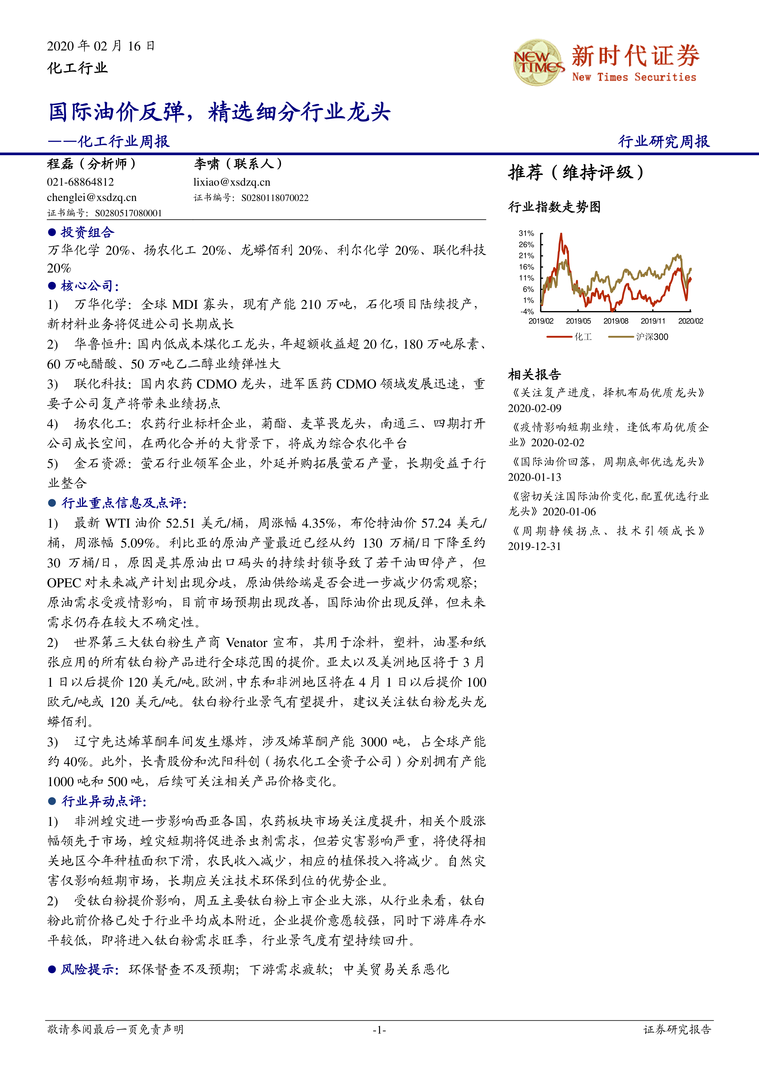 本报告核心观点指出,在国际油价出现反弹的背景下,化工行业应精选细分领域的优质龙头企业进行投资。尽管国际油价反弹为市场带来积极信号,但疫情对原油需求及整体化工产品供需链的影响仍存在较大不确定性。报告强调,应关注那些具备全球寡头地位、低成本优势、新材料业务拓展或受益于行业整合及特定事件(如钛白粉提价、农药需求增长)的领先企业。