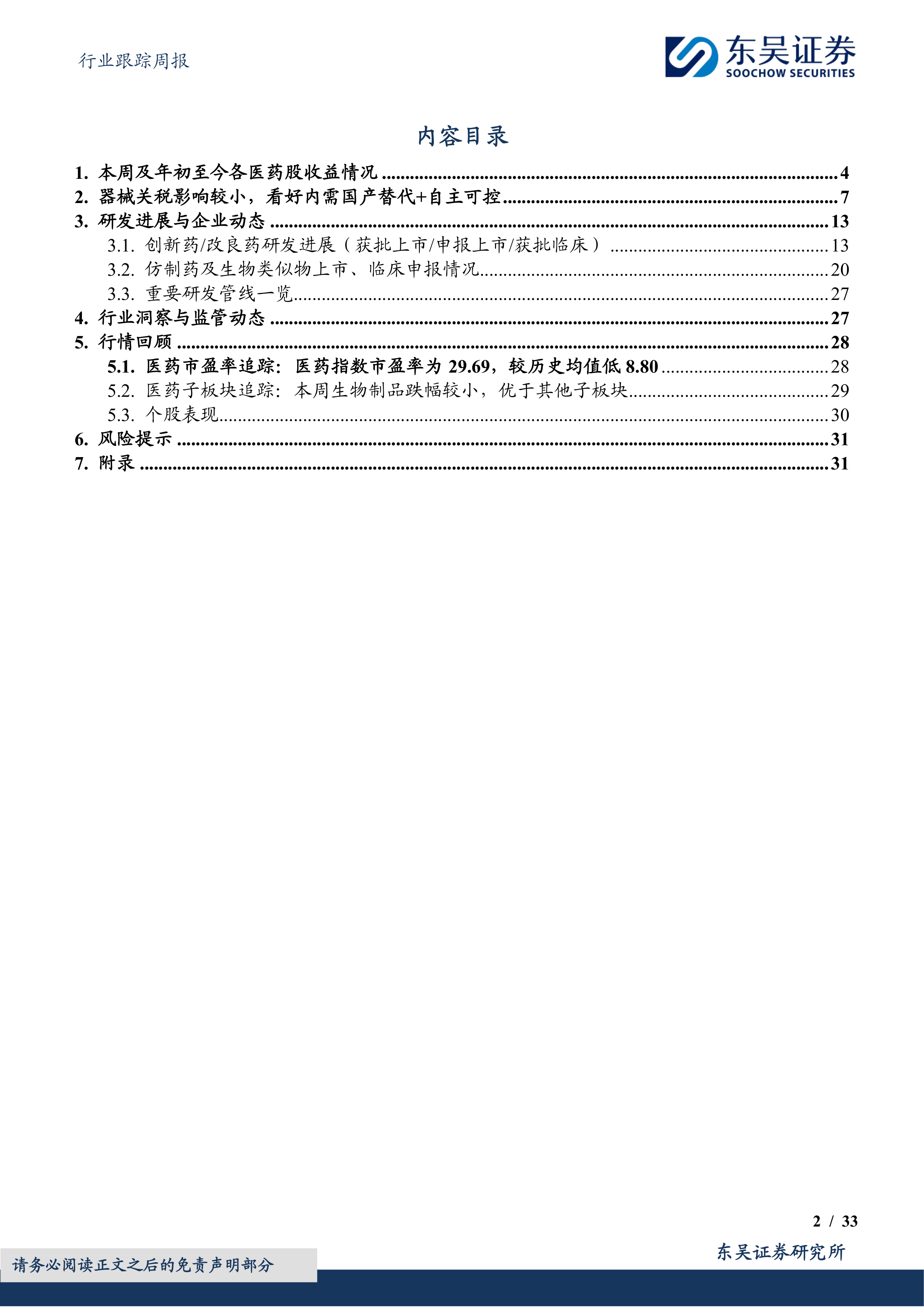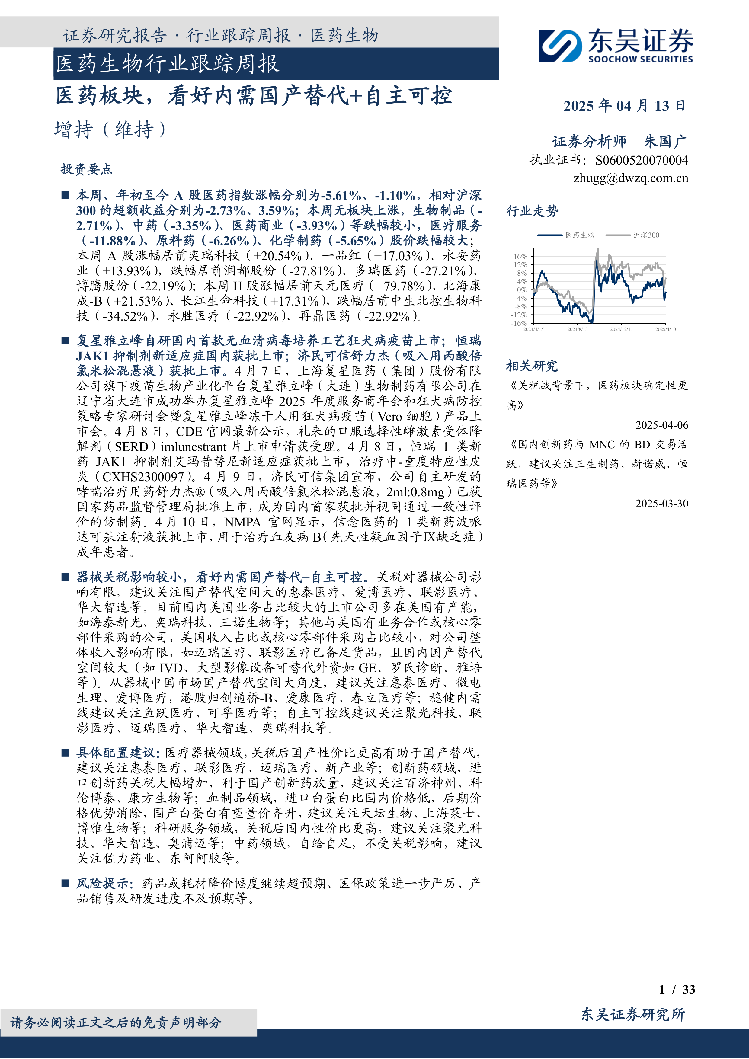 本报告核心观点指出,尽管近期A股医药指数有所回调,但年初至今相对沪深300指数仍实现超额收益,显示出医药板块的韧性。展望未来,报告坚定看好医药行业的内需国产替代和自主可控两大主线。在当前复杂的国际贸易环境下,特别是器械关税对国内企业影响有限,反而为国产医疗器械、创新药、血制品、科研服务及中药等领域提供了加速发展的战略机遇。报告强调,通过技术创新、产业链自主可控以及政策支持,中国医药产业有望实现高质量发展和市场份额的持续提升。