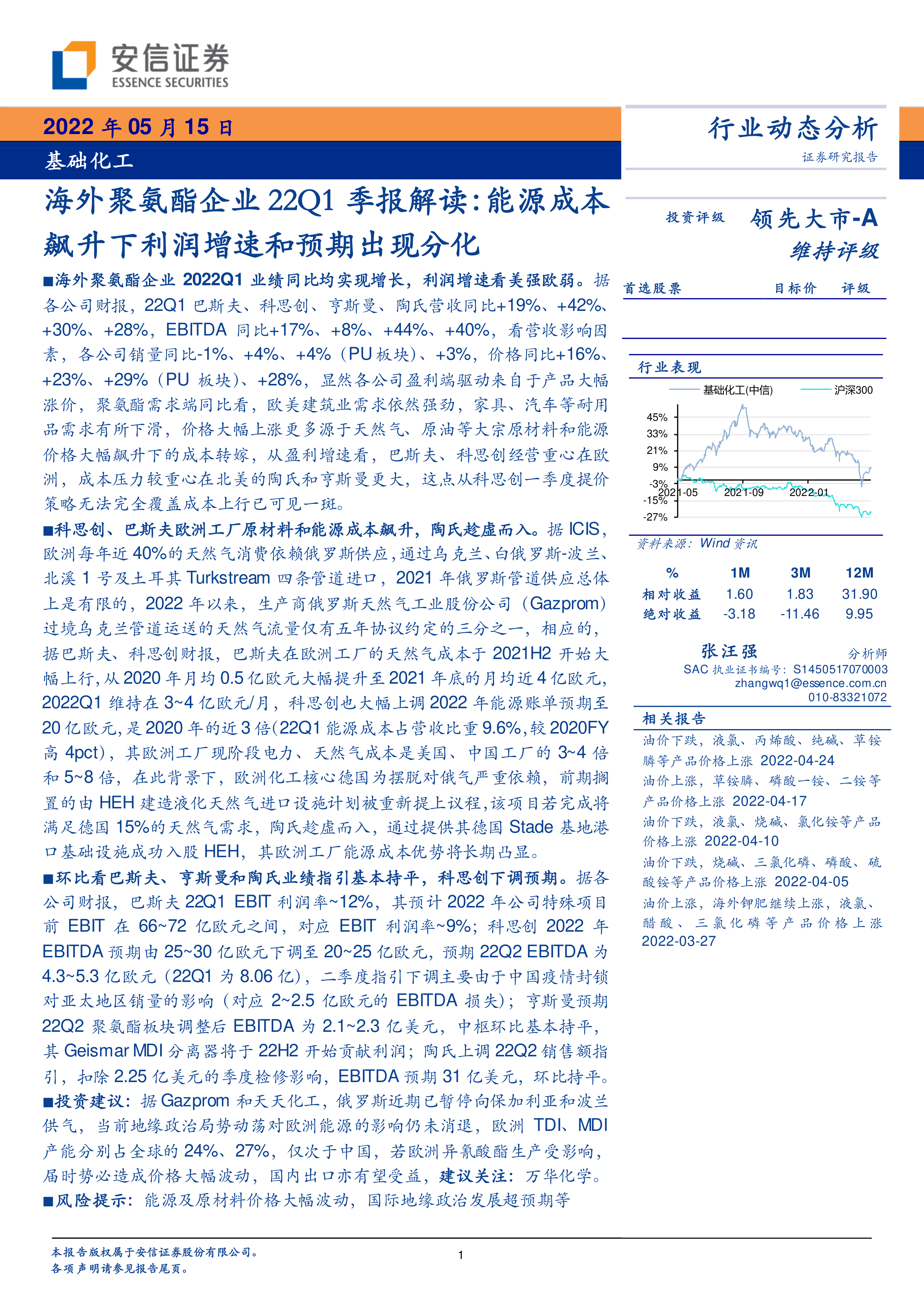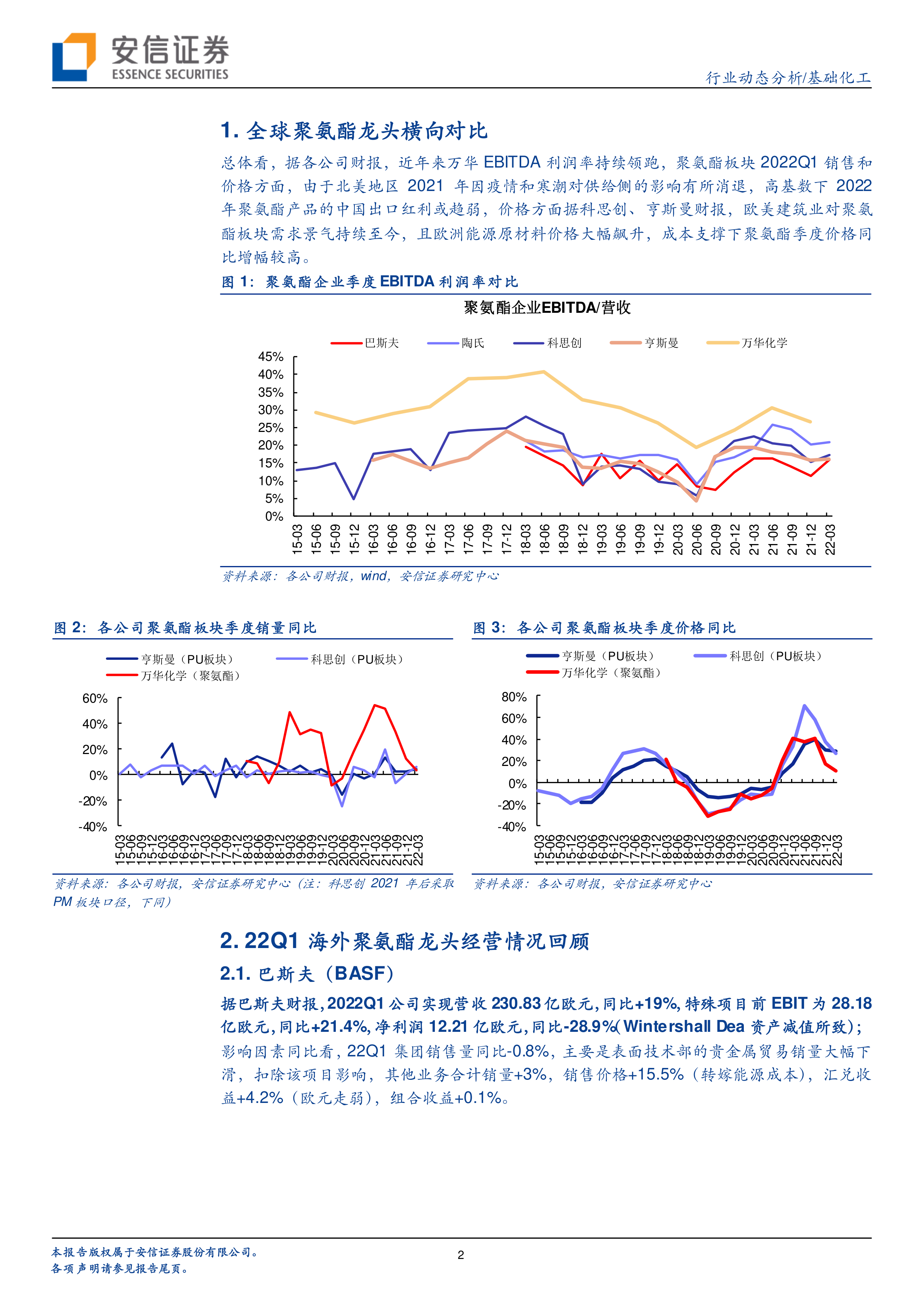 基础化工行业动态分析:海外聚氨酯企业22Q1季报解读:能源成本飙升下利润增速和预期出现分化